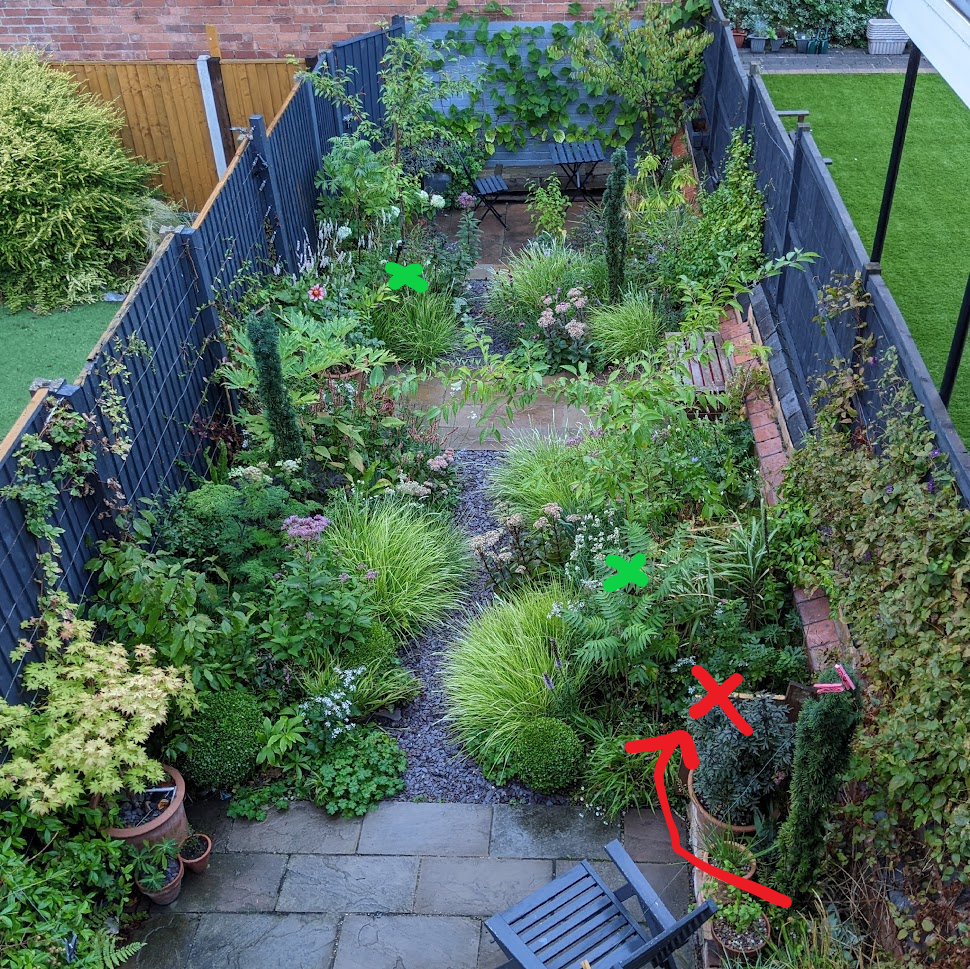 Thanks @K@KeenOnGreen! I could move the third one from it's current position (which it isn't enjoying anyway, too dry) to the red cross. But I am pretty sure I tried that when I set them out a couple of years ago and decided they were too close or something.. and now it might be too close to the Prunus (positions marked with a green cross for clarity). I feel like I've created a bit of a spatial puzzle to accommodate them to my total liking.