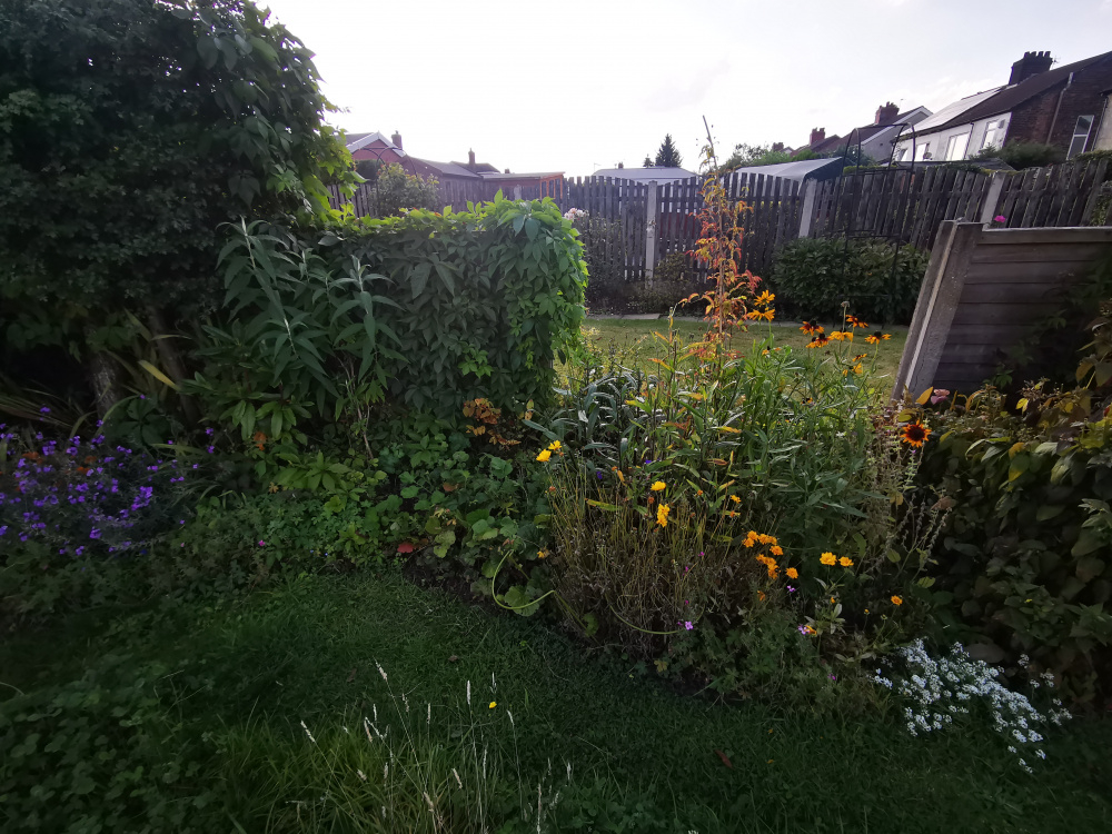 Here is a photo of the top part of the garden as a whole with the cursed border over to the right - this was taken in May/June when everything was a bit happier. You can just about see the large cherry blossom at the far right with the virginia creeper climbing up. The Hawthorn is in the cursed border (I forgot that was there because I don't like it but the blue tits often nest in it so it can stay) and the other large shrubs/small trees in the back right are in their own raised border.
