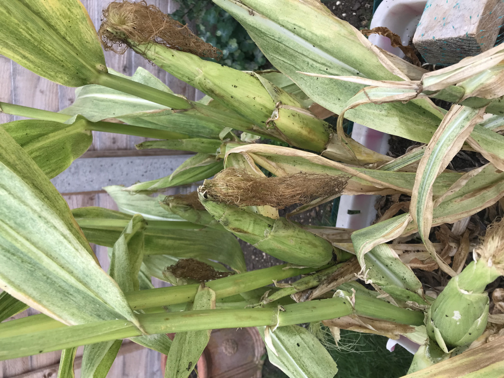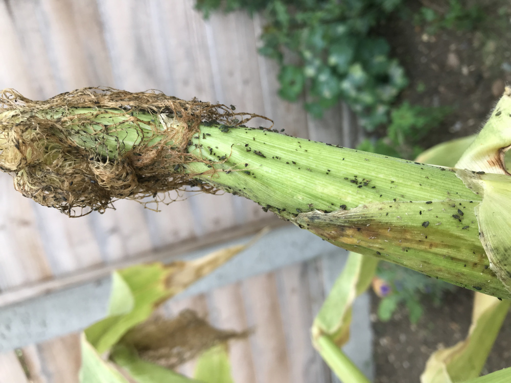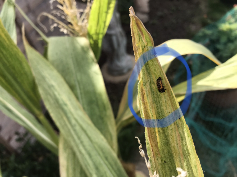 Hi everyone, I wonder if anyone could give me some advice please? I planted a few corn seeds in a big tub and after many weeks they have cobs on them. Trouble is it’s absolutely covered in tiny black insects so I sprayed it with a diluted washing up solution and they went and returned. Problem is when I went to spray again I notice several bigger black insects with orange in their backs and also a couple of ladybirds. Could it be the infestation is ladybird ‘babies’? I wouldn’t want to harm ladybirds. The plant is not very healthy but I’m not convinced these black specs are eating it. 🤷♀️I’m really not sure so any advice would be great. Thank you 0