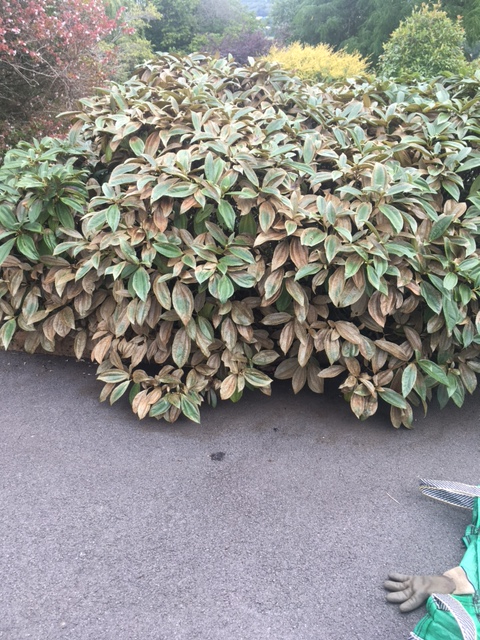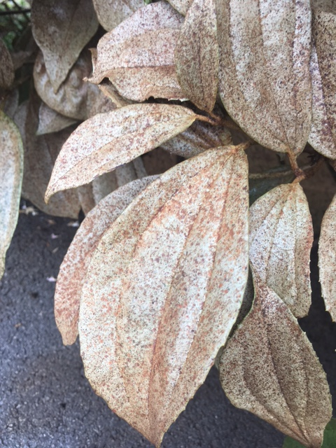 Does anyone know what's happening to this viburnum? The leaves are all turning a kind of silvery-brown. It's not crispy like a dried leaf so I don't think it's the recent heatwaves. But any advice from the experts on here would be appreciated. Many thanks