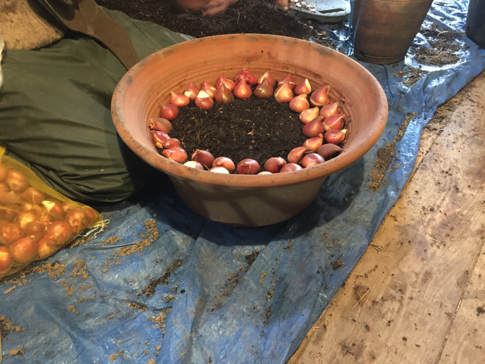 You can see how much they pack in (below). You can see how many tulips are in the pots. I go with their guidelines and haven't lost bulbs since. But mostly I plant in pots.