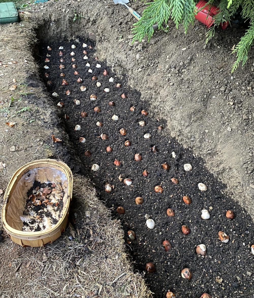 Is that the same for daffodils too? Why do they say on all the packets to space them two bulbs width apart? Yeh I think the trench is too big otherwise would love to cram more in. There is already 100 tulips in there.