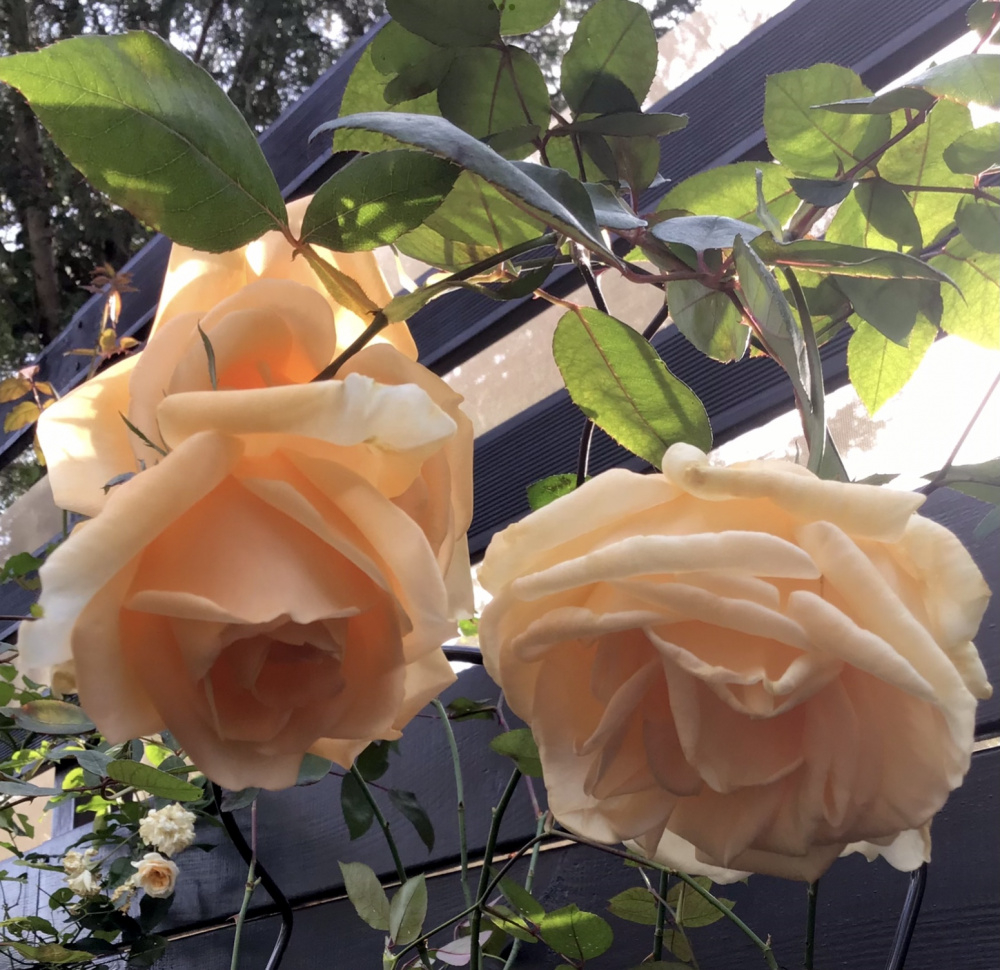The canes aren’t ripened enough to fully support the nicely fragrant blooms yet, but they do have a naturally nodding habit (the advantage of growing it as a climber rather than a shrub). Spring/Autumn blooms: