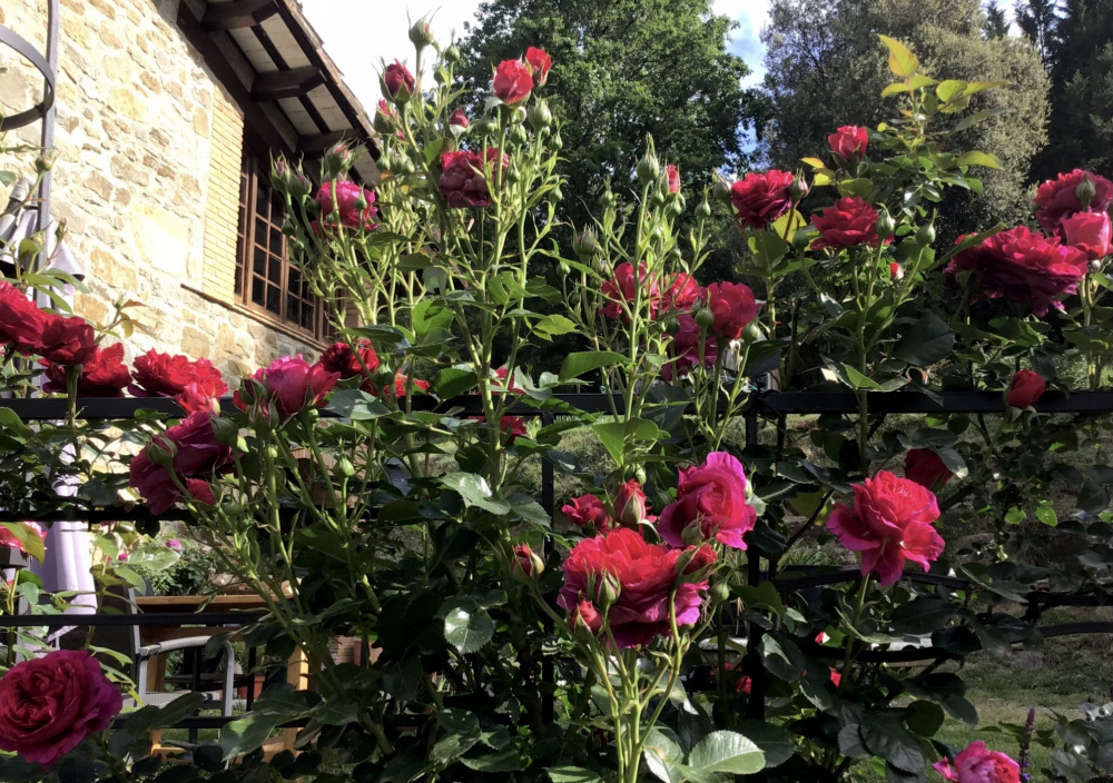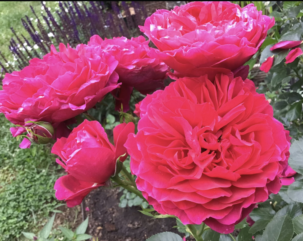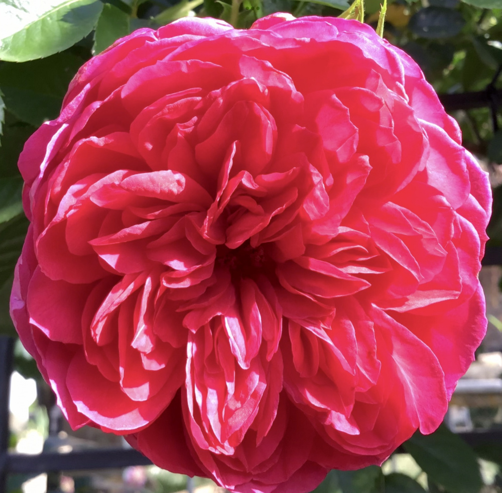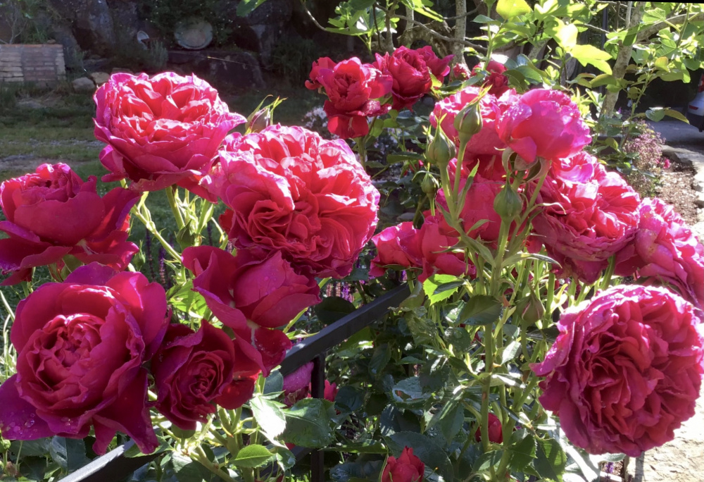 I grow this espaliered on a low fence which has worked well so far since it breaks closely-spaced flowering laterals easily and clothes both sides. It would be a tall, upright shrub left to it’s own devices. Healthy and vigorous for me with good repeat. Large, richly fragrant blooms mostly in clusters. They do spoil somewhat in heavy rain so I’m always watching the weather report and hoping it stays dry during flushes. So probably not one for areas with high rainfall, but otherwise a fantastic rose. Early blooms are more red and later ones purplish pink, but whatever shade it is, the blooms seem to glow in the sun and are quite striking from a distance: