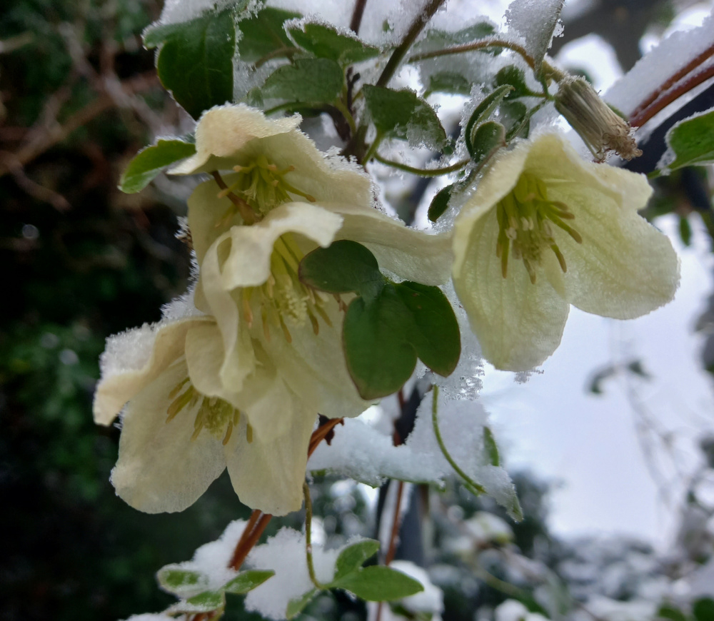 Wisley Cream clematis is about the only flower visible out there just now.