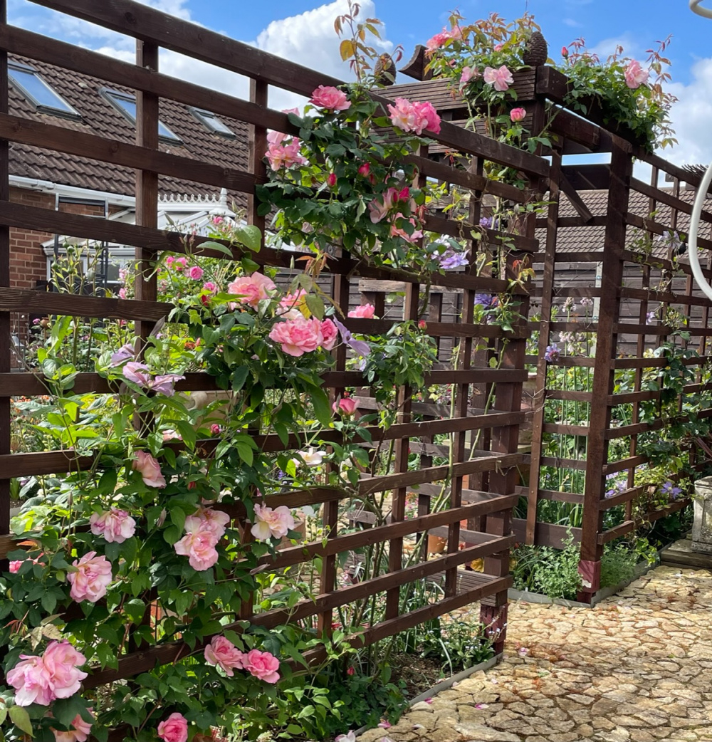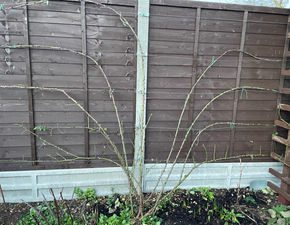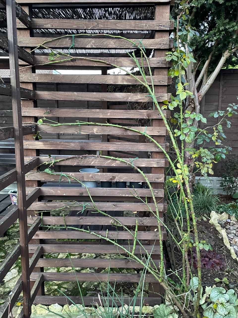 I’m not sure how to deal with Lady Waterlow. I would like to encourage some flowers lower down, but I’ve already trained some branches on the top of the arch. Should I start again by cutting the long branches short and training them horizontally on the right?
