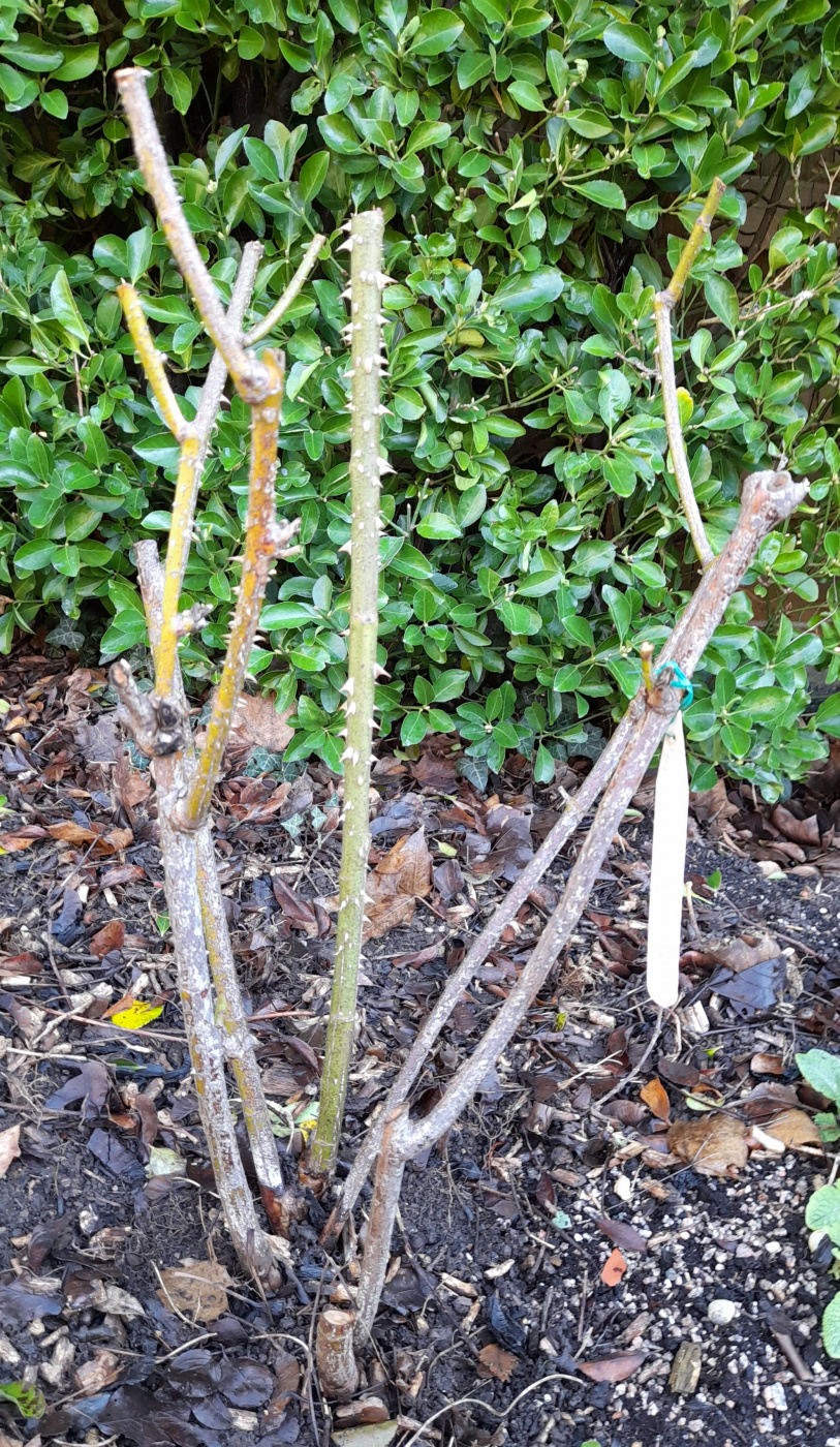 My pruned Roses, any comments welcome. They all get to 6ft or over, 12 years old, face west, clay soil, backed by euronymus hedge so not in the best of positions. MM has always struggled. , Margaret Merrill Gertrude Jekyll Winchester Cathedral, I know I need to cut off the dead stump but need a new pruning saw first!