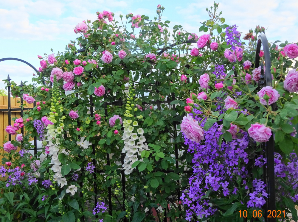 .also essential for me is the sweet violet Hesperis Matronalis on the right, which needs support but has good fragrance and blends so well with pink roses..