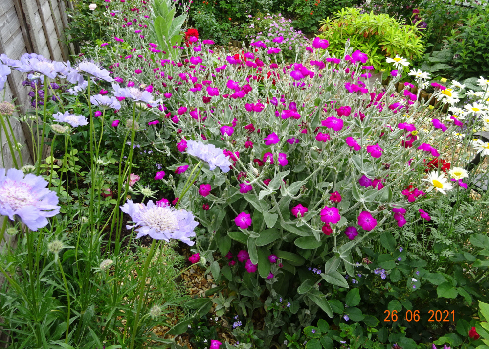 Ok Peter, you did ask.. here are some pics of some favs. of mine.. they all have a decent flowering season, but you are maybe a couple of weeks later than I am here, and in turn, I'm a bit later than London and south coast.. Veronica 'Marietta' offers a dark, rich blue.. not too tall.. Astrantia 'Roma'.. very long season and essential for me here.. ..simple seeded Lychnis coronaria, the pink reflects the pink in your roses.. Geranium 'Russell Prichard' my longest flowering Geranium.. Geranium 'Johnson's Blue' / Salvia caradonna.. I think a good mix.. Geranium 'Patricia' with a pink rose... Geranium psilostemon is similar but taller.. .my longest flowering Phlox, 'Amethyst' I also love this colour with pink roses.. ..tall, simple and elegant white Foxgloves, or the usual purple for height.. .also essential for me is the sweet violet Hesperis Matronalis on the right, which needs support but has good fragrance and blends so well with pink roses..