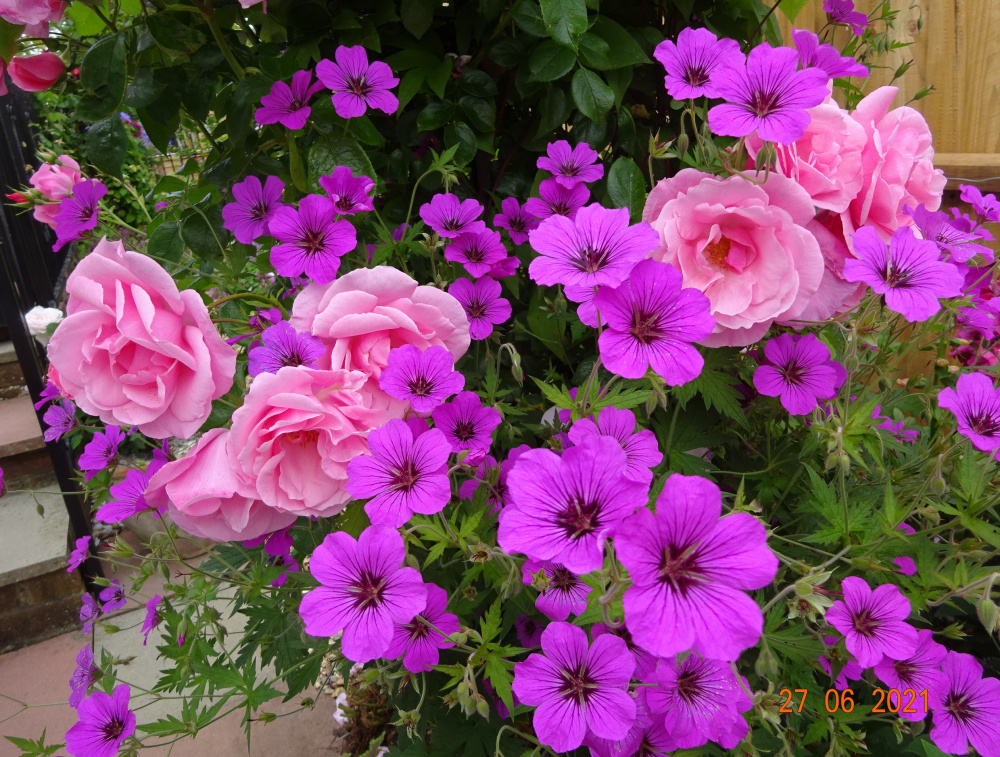 Geranium 'Patricia' with a pink rose... Geranium psilostemon is similar but taller..