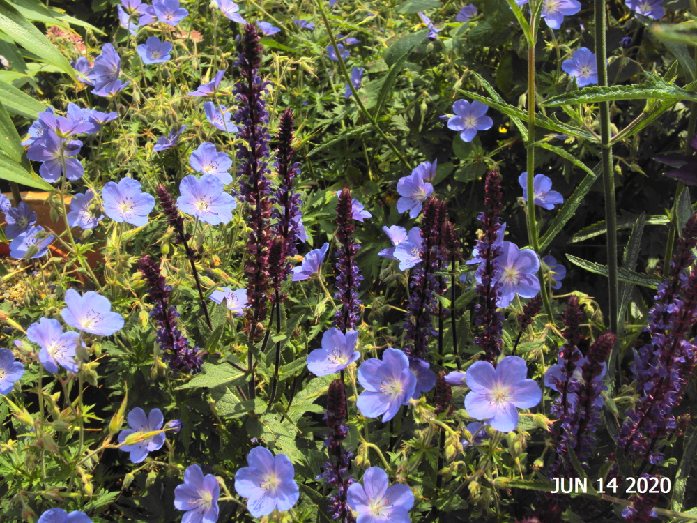 Geranium 'Johnson's Blue' / Salvia caradonna.. I think a good mix..