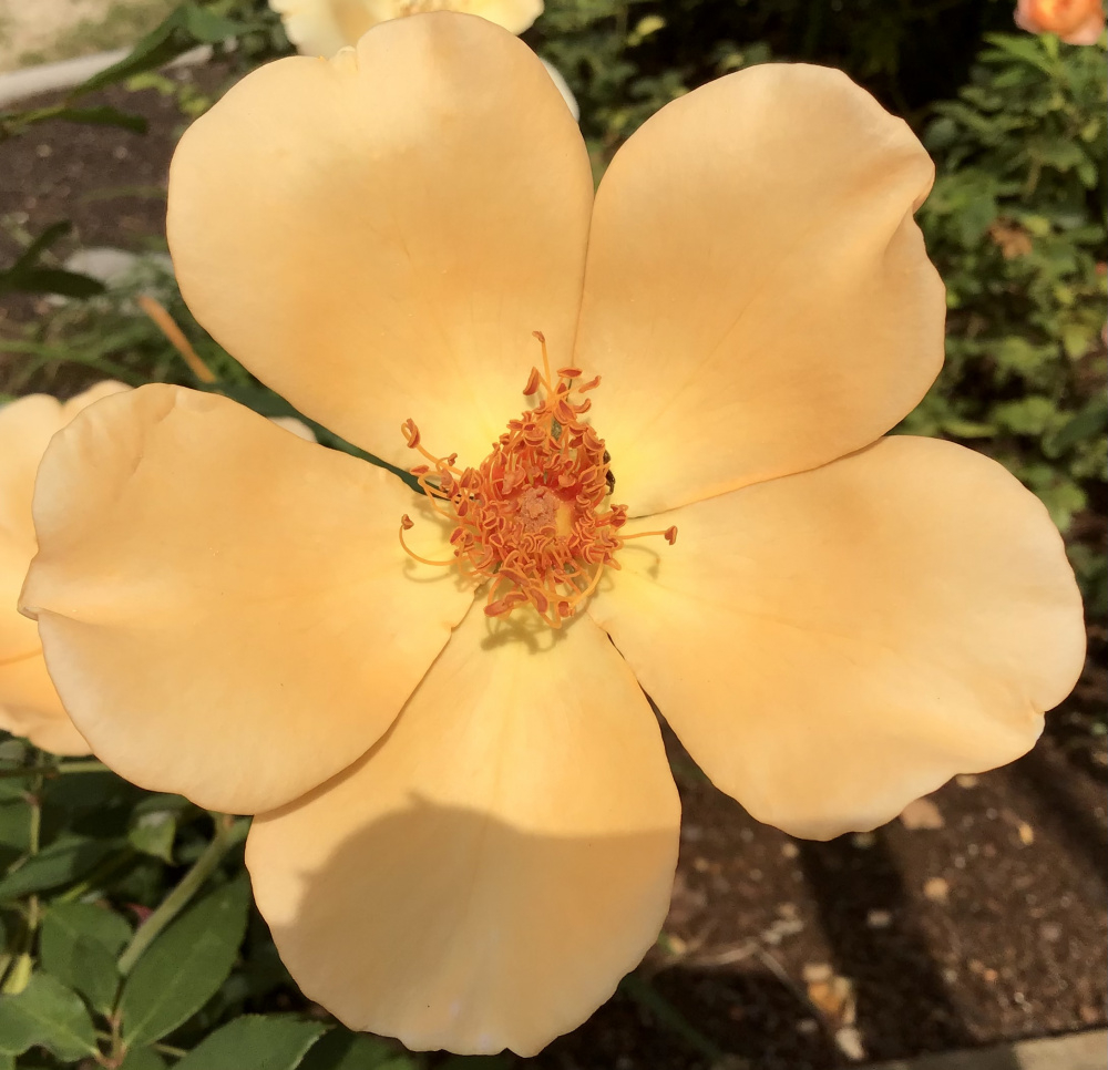 Mrs. Oakely Fisher, a Hybrid Tea from 1921 with very large, single blooms. Nothing like the glamorous high-centred blooms on stiff, upright canes that we usually associate with HTs.