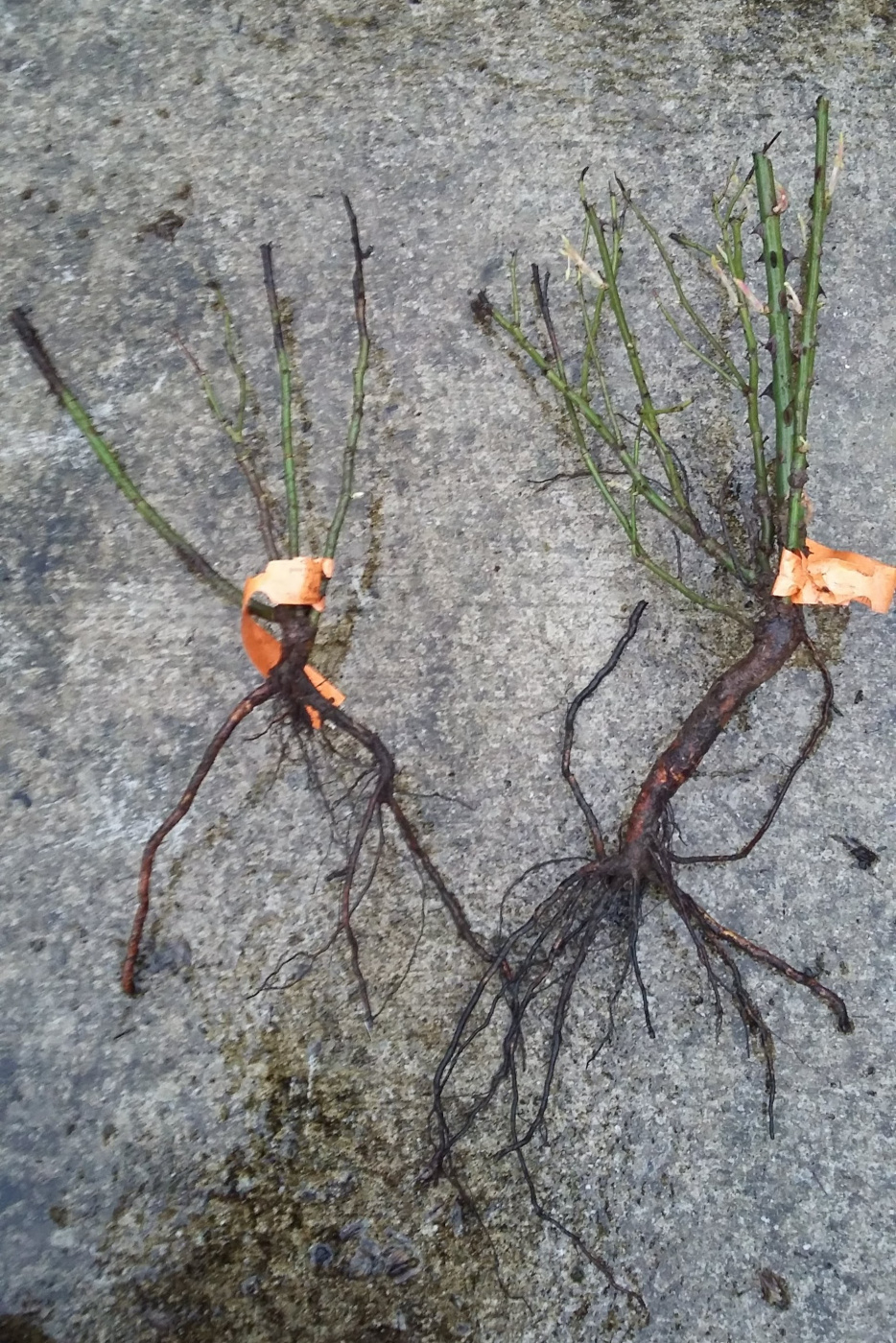 I'd really appreciate some advice, please, about the roses which came today from TCL. They were despatched on December 29th so have been hanging about a while en route, in a black plastic sack in a strong cardboard box. They mostly look pretty good, though many have produced etiolated white shoots like 'Scepter'd Isle' on the right in the photo, and some also have white new growth on their roots. The rose on the left is 'Falstaff' and appears the weakest - it has some mould on ends of stems as well as quite a bit of dieback.
