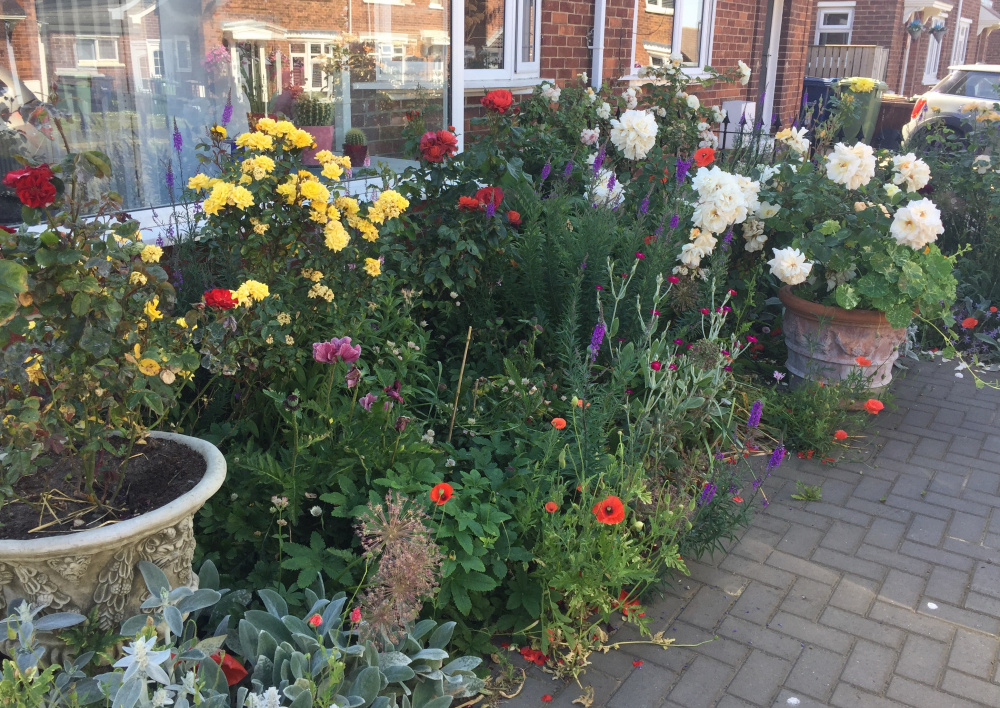I added two roses to the mid border part of the dogs-leg, about where the cane and linaria is. English Garden (new) and Global Beauty (potted last year) for extra cream and yellow padding.