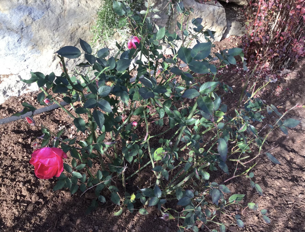 I’ve been slowly working my way along my big south-facing bed, weeding, watering, rose pruning and mulching. Cramoisi Superieur is showing little sign of going dormant. Maybe I’ll just remove the few lower blackspotted leaves and leave the rest on as an experiment..