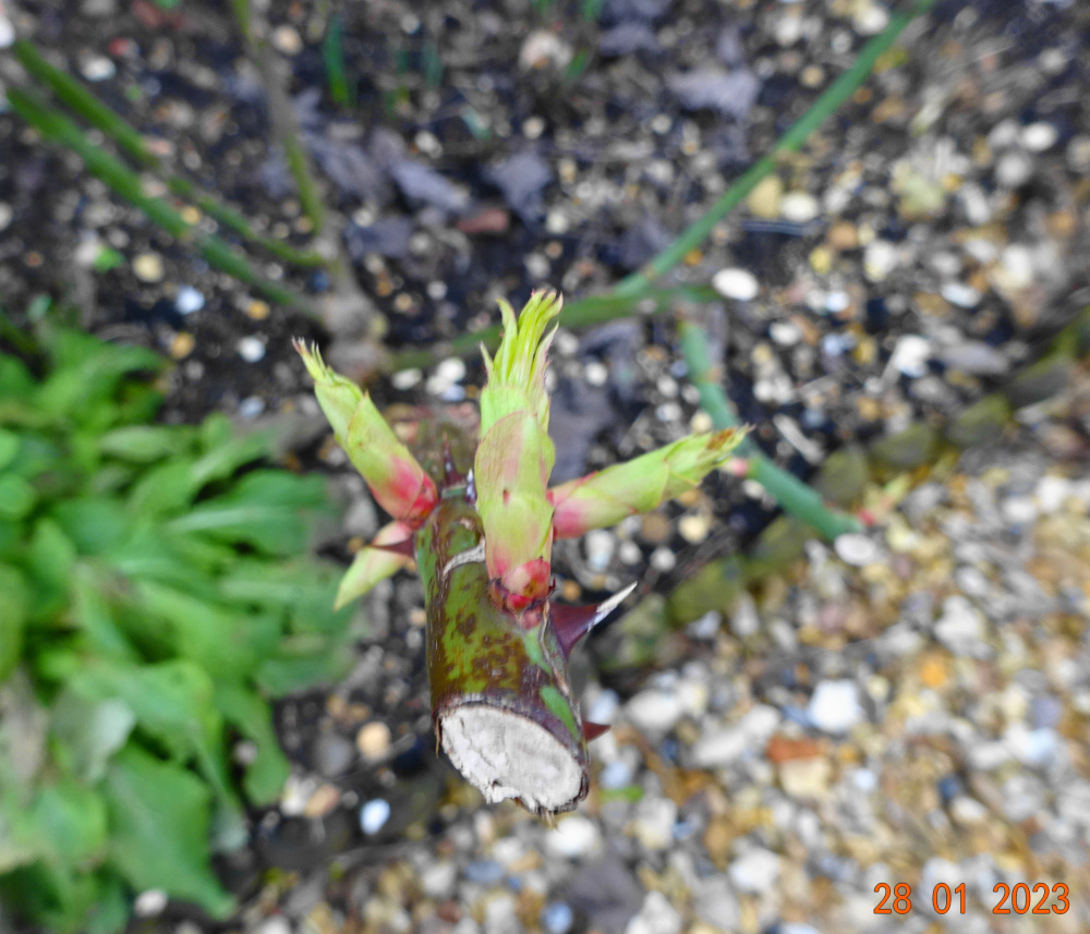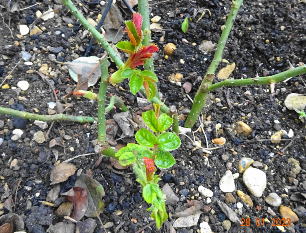I just took a few silly photos, still rather cold here and the thaw is slow.. My little pond still thick with ice.. 'Forever Royal' showing some nice fat shoots.. I planted this 'Reine des Violettes'.. thornless roses are so useful.. 'Elizabeth' likes to get going early it seems.. ..my chosen fertilizer again this year.. ..a fairly balanced NPK, with good supply of Magnesium, a macronutrient, and also micronutrients like Boron. I like this Iron level too, the latest DA one is lower.. Manganese is essential micronutrient. If you notice yellow veins in the upper leaves of your roses its likely Manganese deficiency rather than Magnesium, which tends to affect lower leafage - so I'm told...