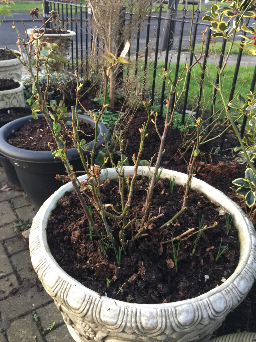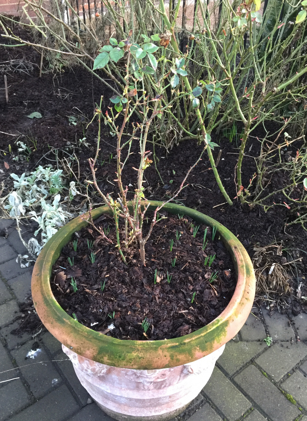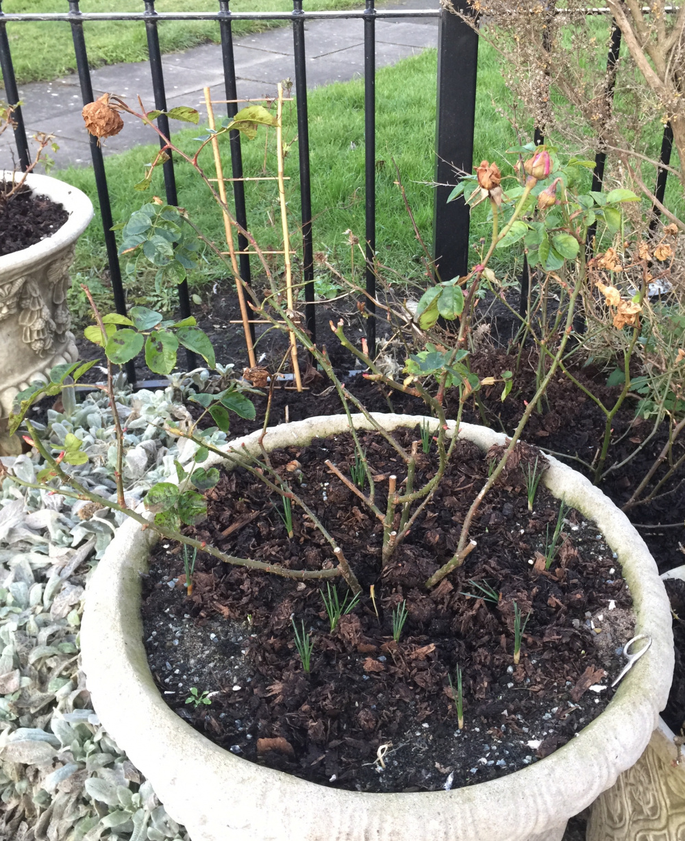 @Victoria Sponge Your potted roses are looking rather good. I used to grow Crocus in rose pots too.. be prepared for rapid spread from these, especially after you have fed the rose. Next Spring you'll be amazed at how quickly they colonise..