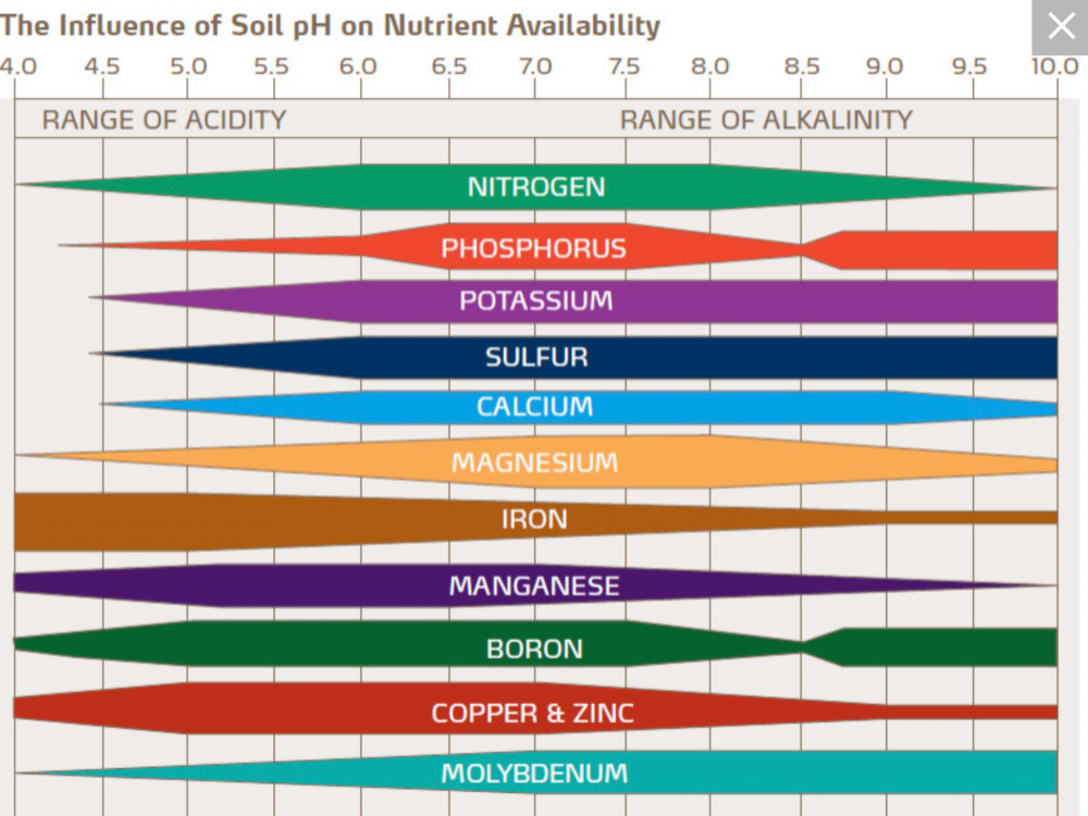 Soil pH is an important factor as this chart below shows, if your soil is very alkaline (pH 8 or above) it can lock up important trace elements such as iron, manganese, possibly boron, copper etc. and this is when a plant can show signs of a nutrient deficiency. Very acid soils are differently problematic..