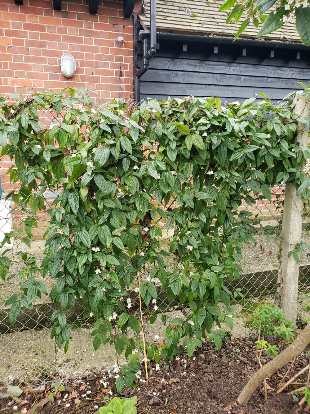 Nothing much hides the fence yet but this clematis Winter Beauty was only planted last year (Thorncroft's). Shrubs will become large too, not a spot for roses as it's in deep shade when the overhead Ash leafs up.