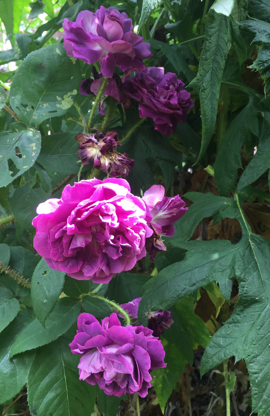 I cut many of my roses back harder than usual so only shoots showing here for the most part so far. Here's one I hacked back two years ago in the hope of promoting lower growth, the Moss, William Lobb. It didn't work but never mind It just does its own thing and flops around on the globe thistles for support.