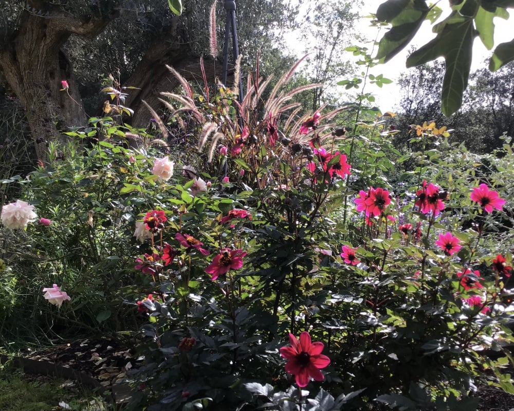 Mme. Antoine Mari, Pennisetum Rubra and Dahlia Diabolo: