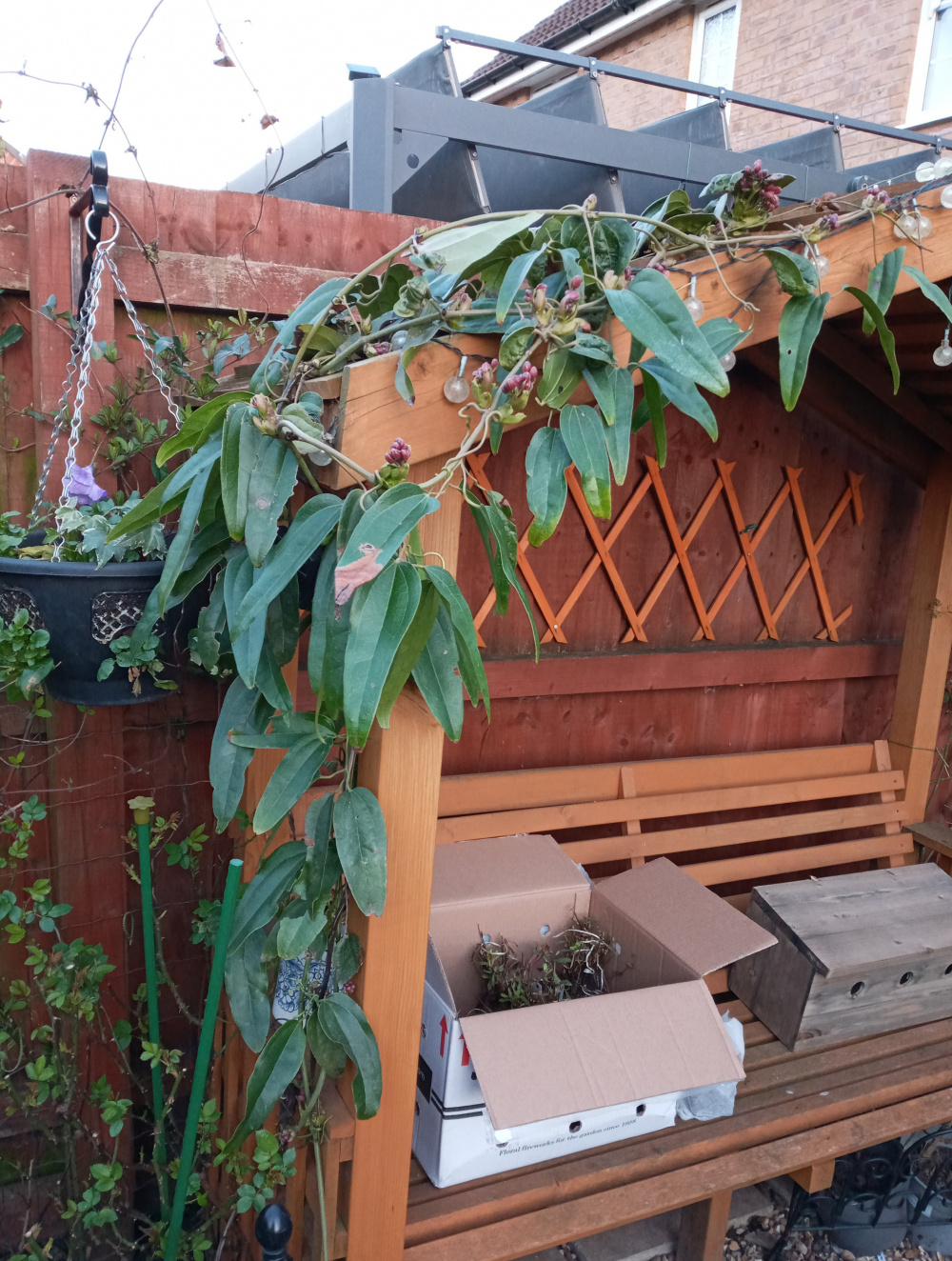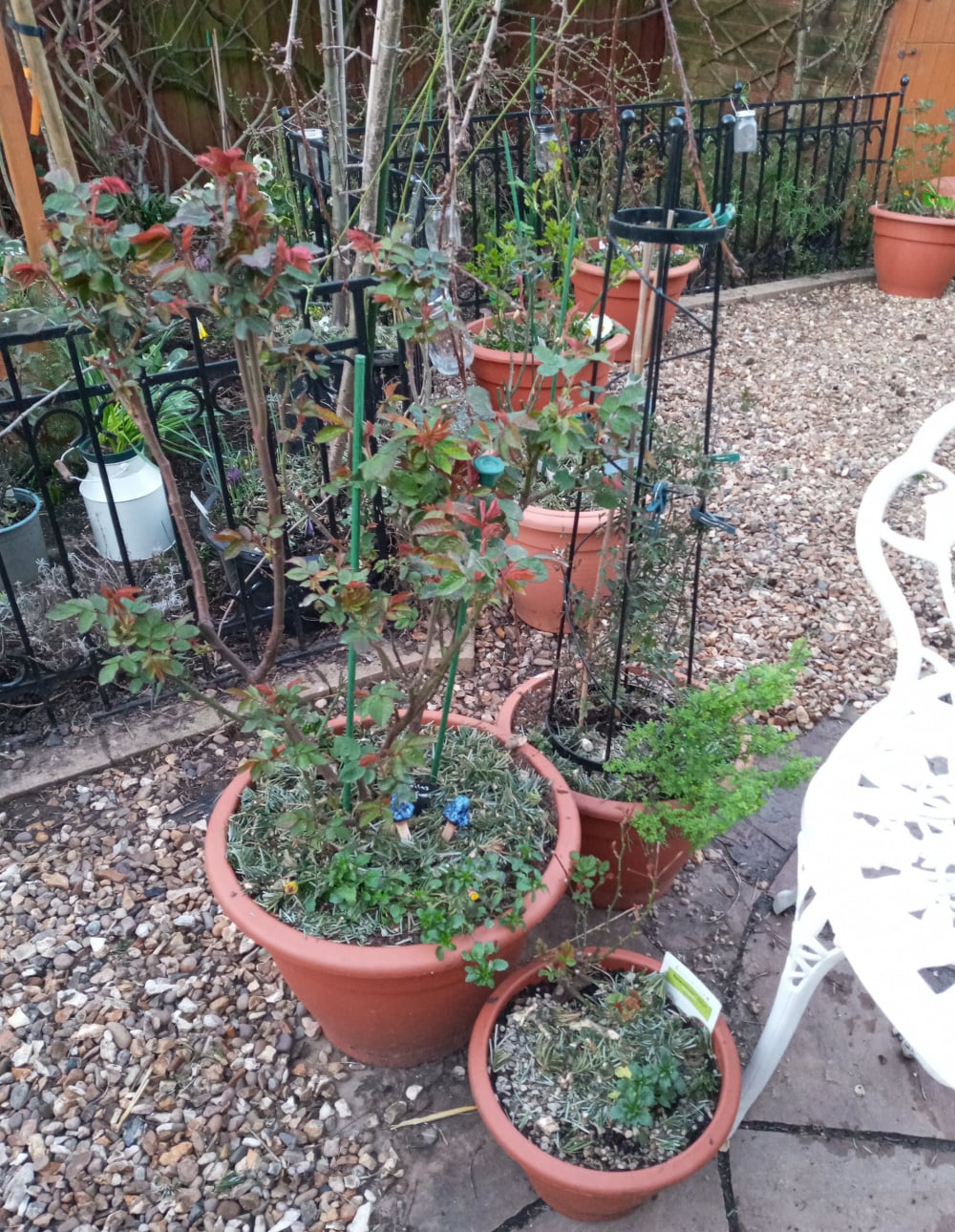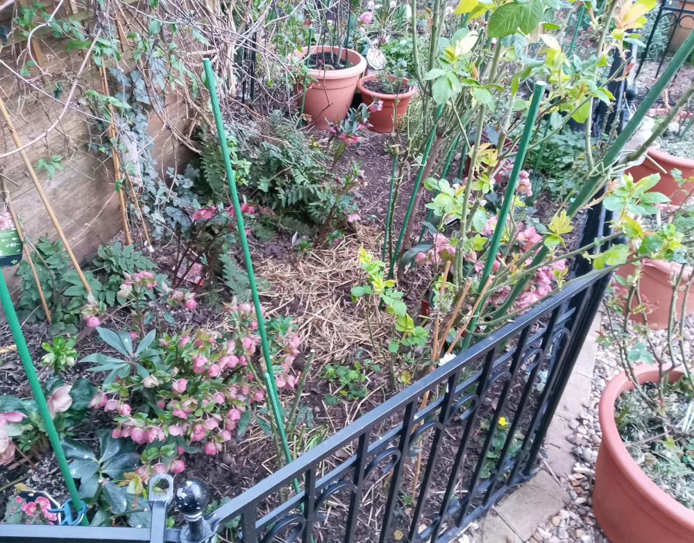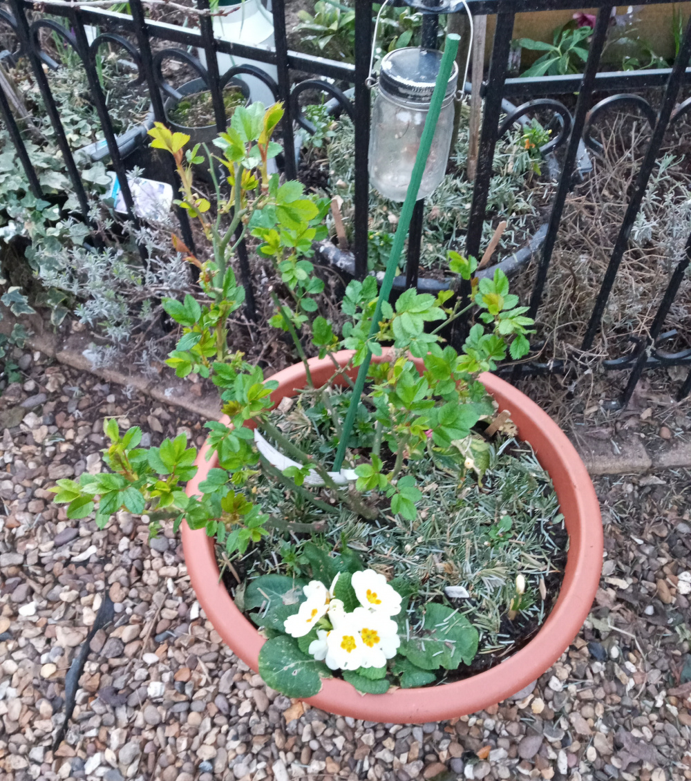 Roses really leafing out here, especially in pots! My clematis armandii apple blossom is finally budding this year, covered in them all up the stem too. Excuse the cardboard box - had a nice peter nyssen 9cm perennial order again! I can see buds on my Cartmanii springclematis again, although probably not as huge a display as last year as the female set beautiful fluffy seedpods and those stems then die off as spent.