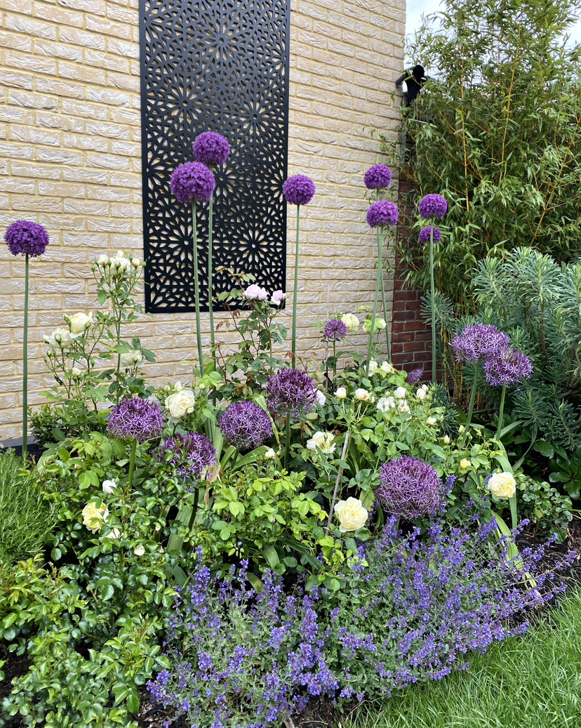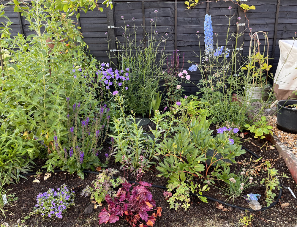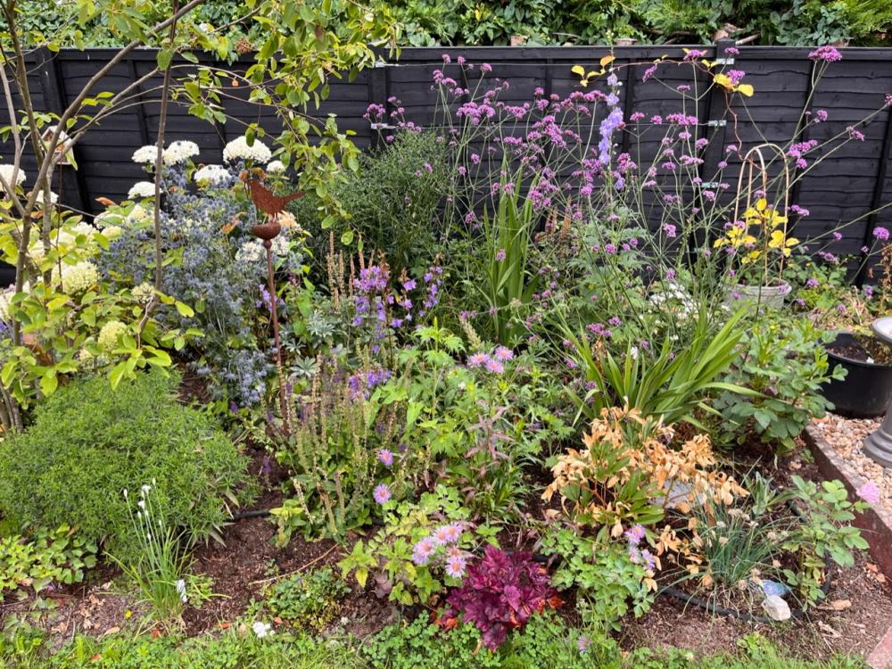I’m going to add at least 2 more roses, one I think will be ferdinand pichard as I have a plant I grew from a cutting. What else should I put in? I think ideally I’d like a white rose as there’s not much white on this side, but the colour scheme is pinks/whites/blues/purples!