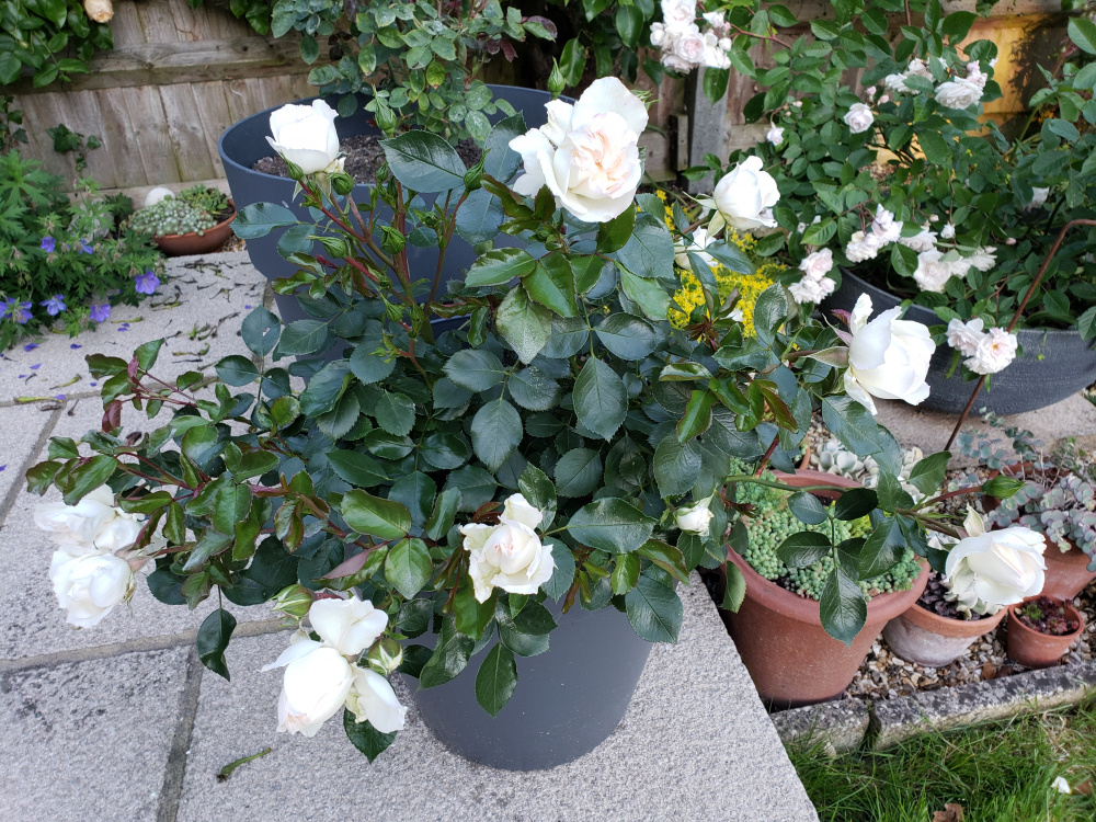 I love Medeo in the urn too @pitter-patter, not that I have anything similar, but I’m going to nick that idea and keep my eye out for a tall, cylindrical pot to mount a potted ground cover rose on. It’s Avalanche Abricot from my Delbard order last year, which has lovely soft-toned blooms: