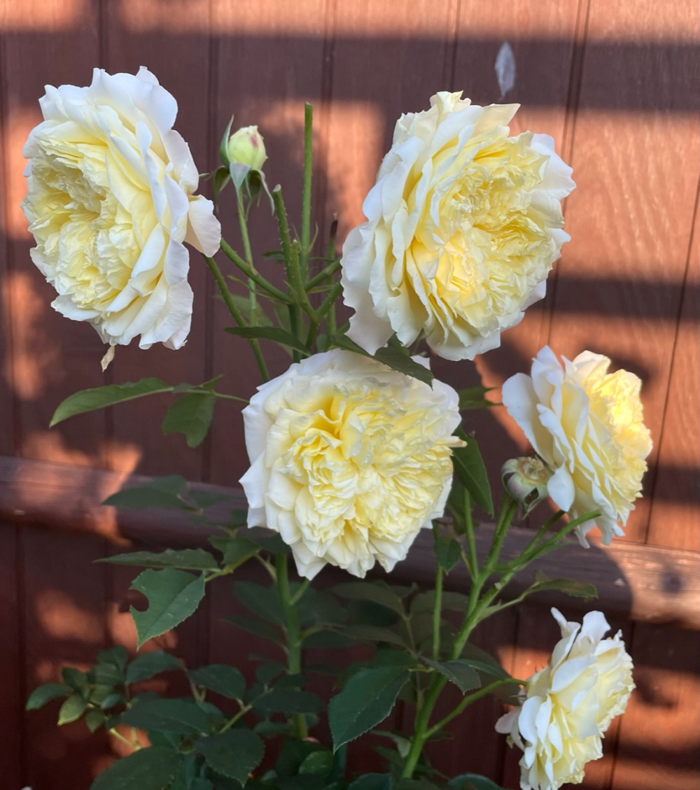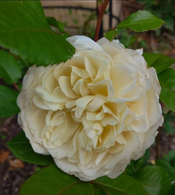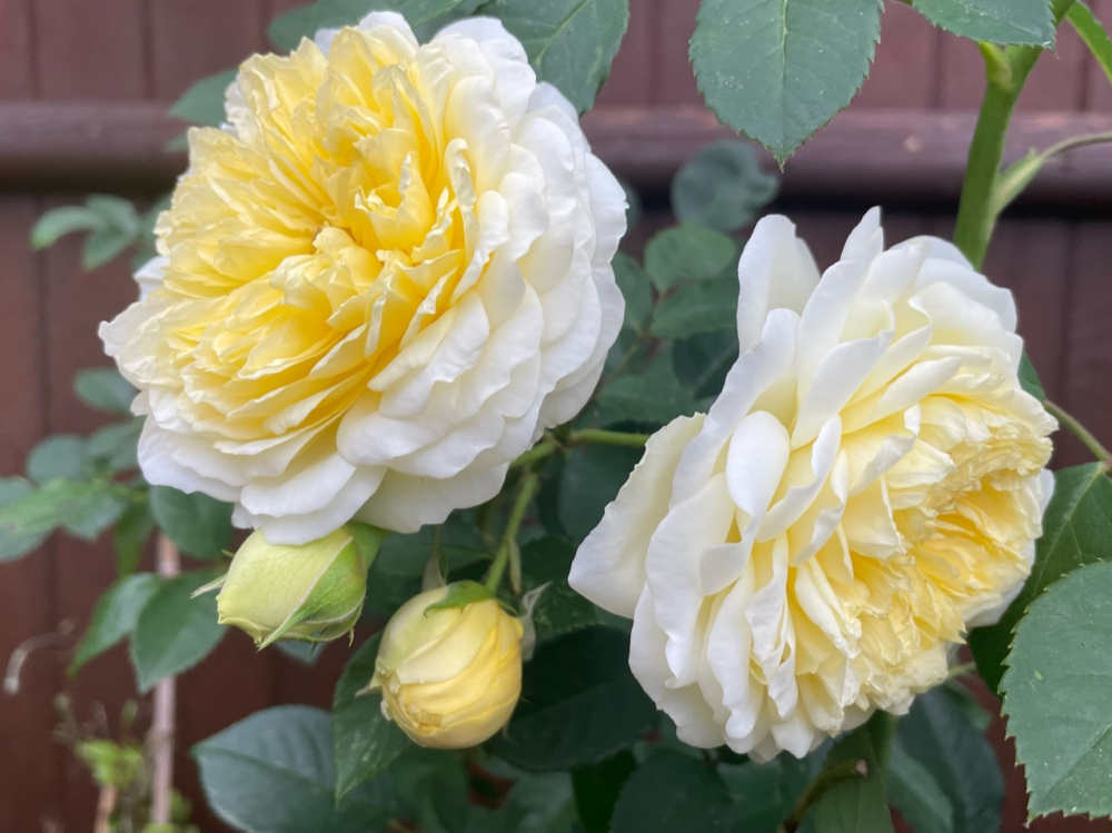 Tranquillity ... so healthy but no scent. I love the yellow shading and its nice big blooms all the same. Hoping it won't need so much staking as it gets bigger. It holds up well to the weather but does brown a bit round the edges from rain/careless watering.