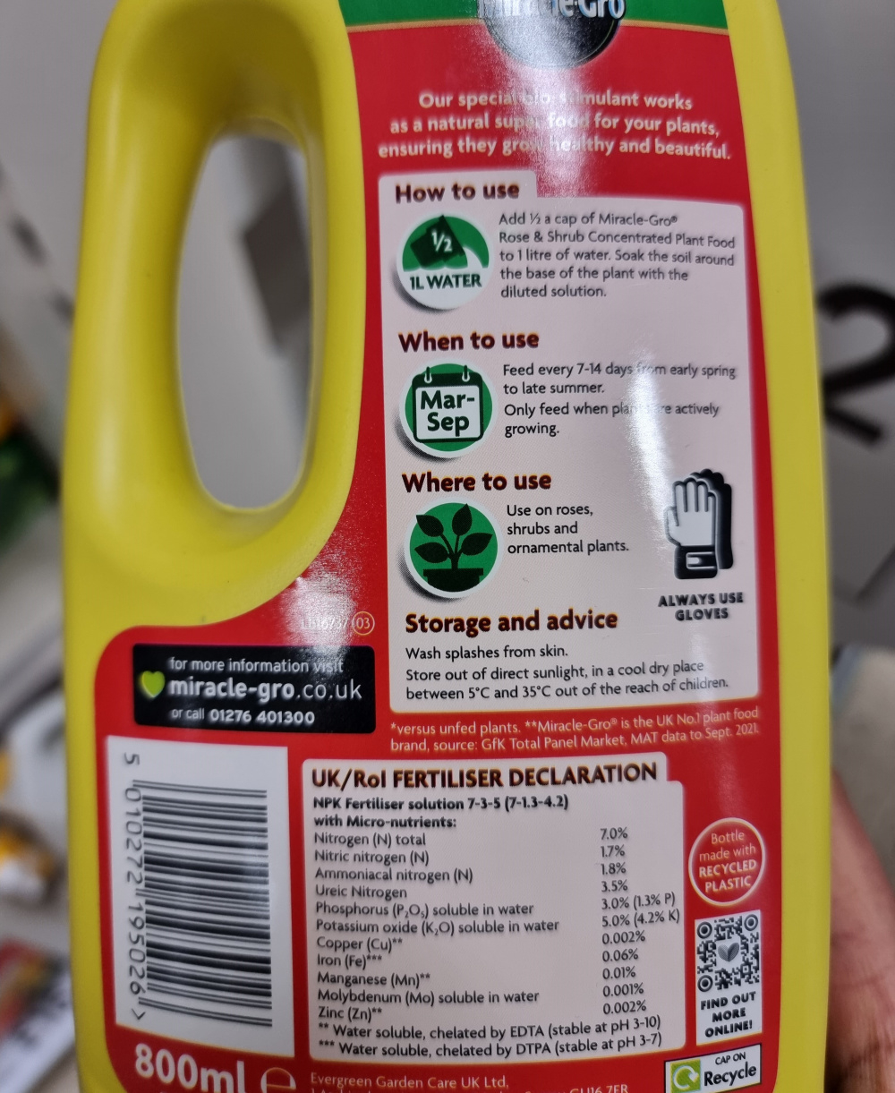 @cooldoc That fertilizer is very good for potted roses, a perfect recipe, just that it doesn't last long if you have a lot of pots, which you do. I used to use it, a little and often rather than full strength to make it last longer.. switching to Tomorite when it ran out..