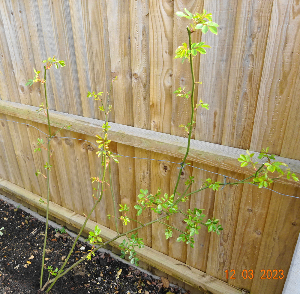 This is it now.. I aim to angle the canes more diagonally later on but it's generous with its lateral breaks.. I love this rose actually, it's always blooming and just the yellow/white mix that I like..