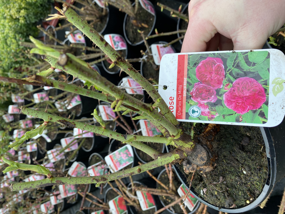 'Charles de Mills' only flowers with one flush, and when you plant it I recommend you do so at the same level as you see in the pot, i.e. do not bury the graft, as is the usual practice, but keep it exposed..