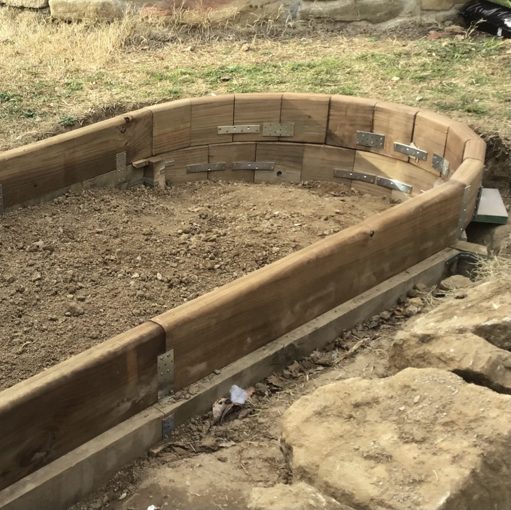 This has proved a bugger of a project, but the base of my new rose bed is finally taking shape. Won’t win any woodworking awards (bodger of the year, perhaps) but the curved end is finally finished: