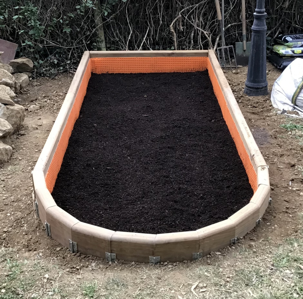 It’s been lined with some rather fetching plastic tile backer sheets and had 6 bags of pine bark compost and 6 bags of manure dumped in. I will dig this into the horrible soil and continue to build it up with a dumpy bag of excavated soil and more compost and manure: