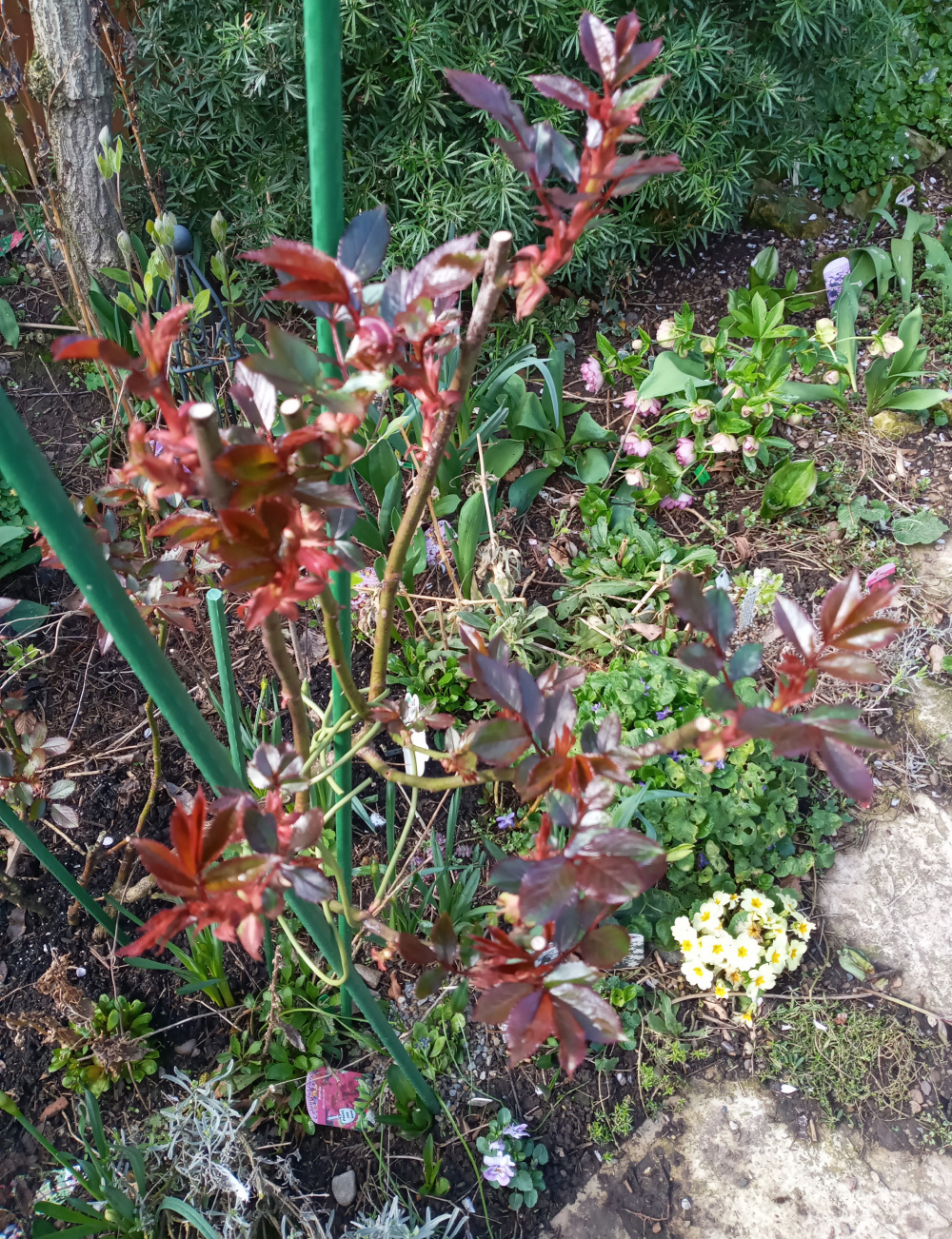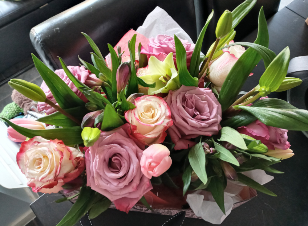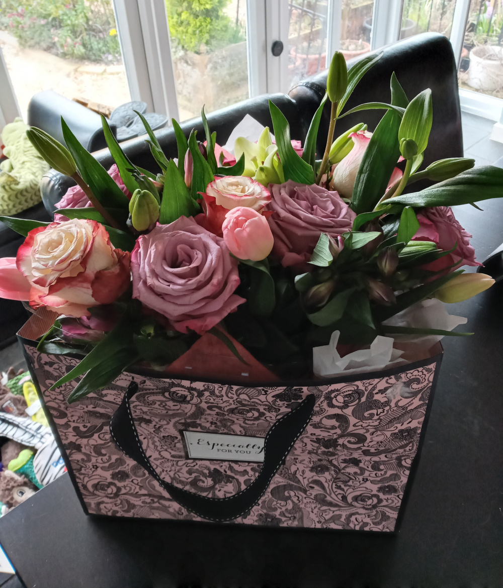 @Marlorena you are rose ID Queen! Wasnt styles, was a named bare root cheapy from you garden I think (or maybe garden express possibly which sell claude monet I see.) So thats a good bet its that if its a common one. Not very bronzy foliage. I cant remember if it gets more yellow, but I dont think so, so your probably right! I shall label accordingly thank you! I do have some nice bronze ones, copper lights Brother Cadfael (older Austin) Nostalgia Mothers day hand tied bouquet I put together myself for my husband to take to my mother in law. For £18 of flowers Im rather pleased. Im assuming the gorgeous purpley one is 'Deep water". Wish that grew here!