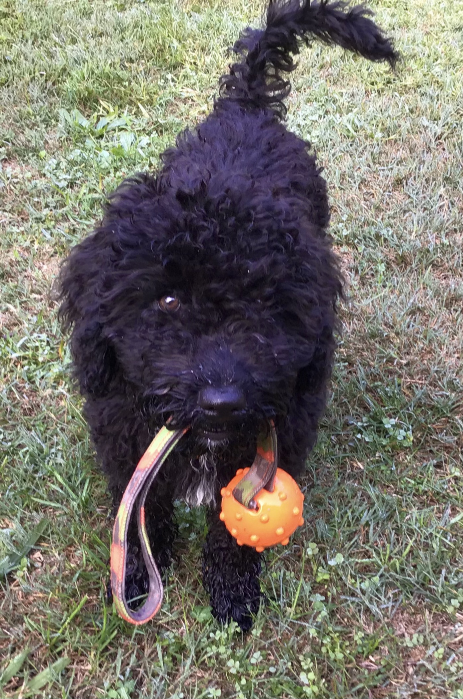 OK, pupdate! Smudge is a very busy and fearless little girl, what with all those dates with people and other dogs, and, Spanish Water Dog style, has taken to training like a pro and swimming like a woolly duck. She coped amazingly well with busy Girona city and seemed to thrive on the chaos. However, she is still hounding poor old boy Bill out of his basket, hanging off his ears and stealing his toys. He’s stoic in the face of her onslaughts and beginning to fight back a bit when she gets out of hand, so there is hope for peace one day!