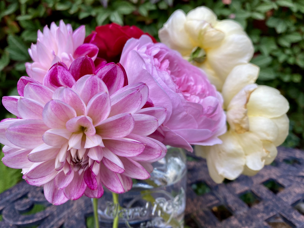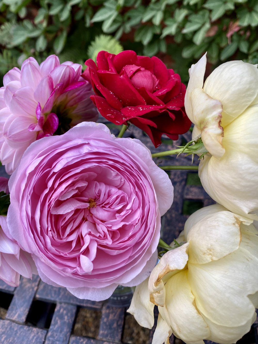 Just my usual plants, happy they’re still flowering: Draga, Olivia Rose Austin, Vanessa Bell, dahlia Embassy and Nicholas