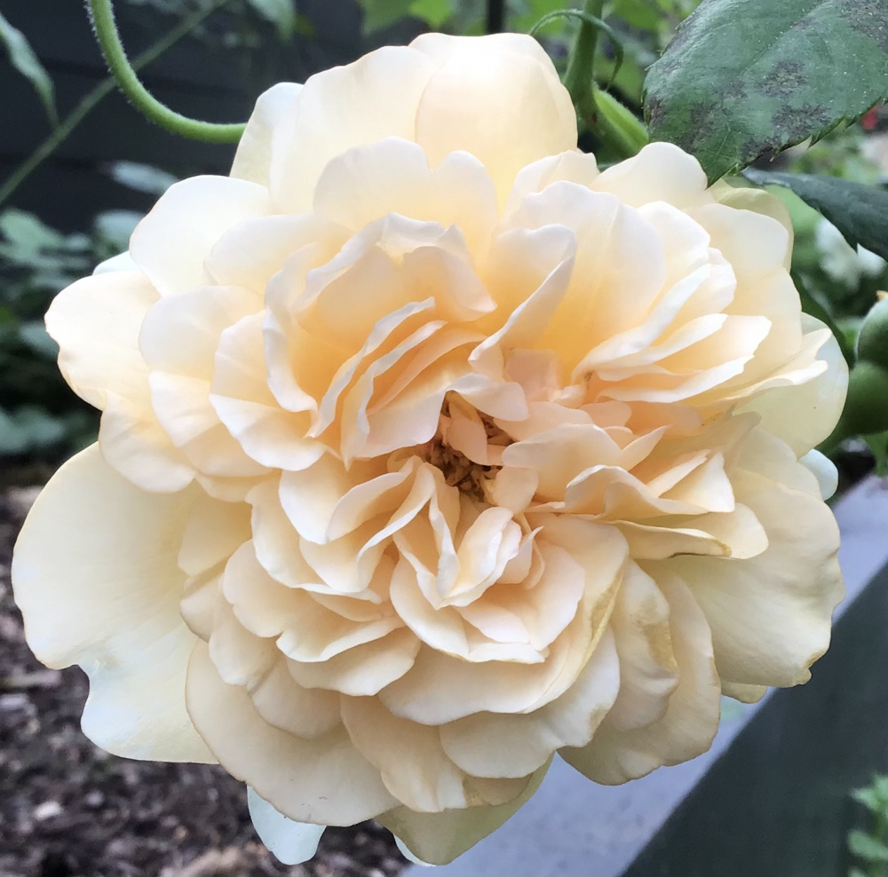 Starts very pink tinged buds, very buttery yellow HT shape when first open, then pales to dark cream open with a visible eye. 🤷♀️ very upright, but this is its first vigorous growth year.