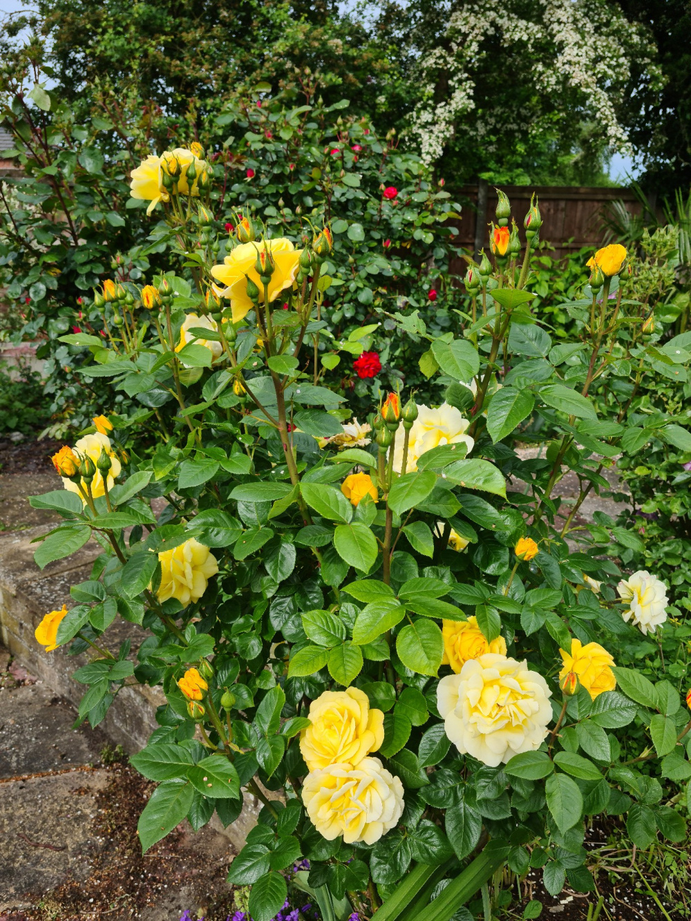 This was my Celebration in flower this year @Nollie , not the same shape rose or habit as yours. Starts very pink tinged buds, very buttery yellow HT shape when first open, then pales to dark cream open with a visible eye. 🤷♀️ very upright, but this is its first vigorous growth year.
