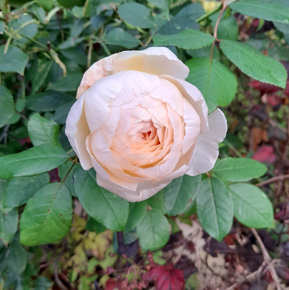 My garden has turned distinctly soggy and autumnal now; this one fades into winter in a nice manner, Harkness climber Summer Sweetheart.