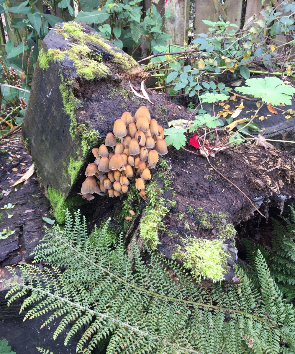 Non-rose but I found this cute arrangement on one of my stump heaps, some 'rooms or 'stools (I don't know) and a geranium phaeum rooted in the soft wood.