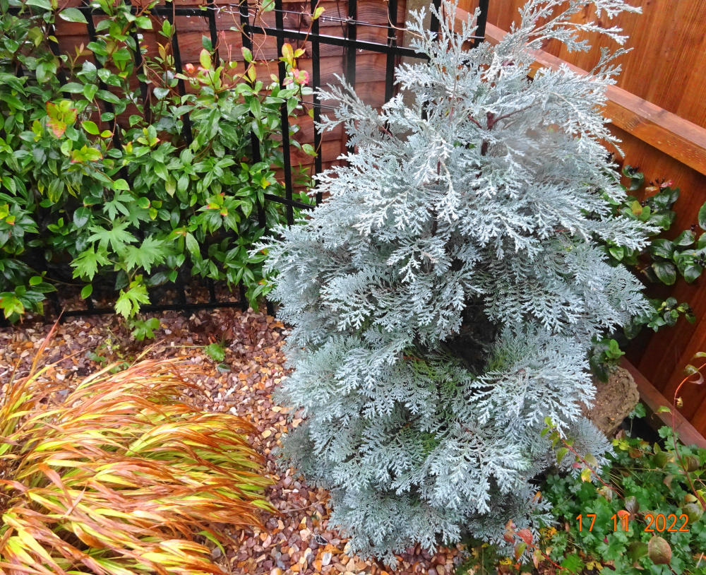 Chamaecyparis 'Van Pelt's Blue'.. slow, narrow and blue.. with Hakonechloa..