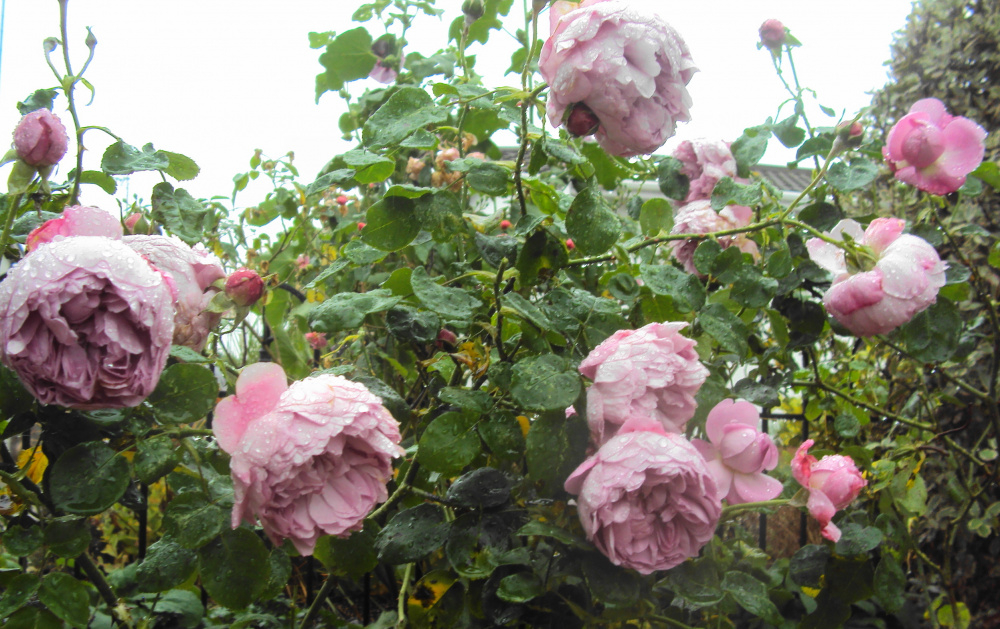 @WhereAreMySecateurs .. I used to have Charles Rennie Mackintosh.. I only have 1 picture which was taken mid October, blowing a gale, and pouring with heavy rain.. I seem to enjoy photo taking in such perverse conditions for some reason.. So it's not exactly a glam shot, but shows the amount of blooms at that late time of year.. continuous blooming, the scent improving with age [not much first year].. the plants - I had 3 in a group, grew to between 5-6 feet and were often a lilac colour, very full.. tallish plants, narrowish growth habit..