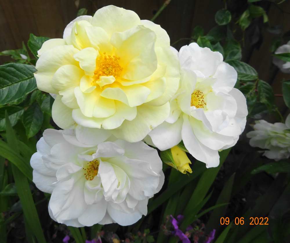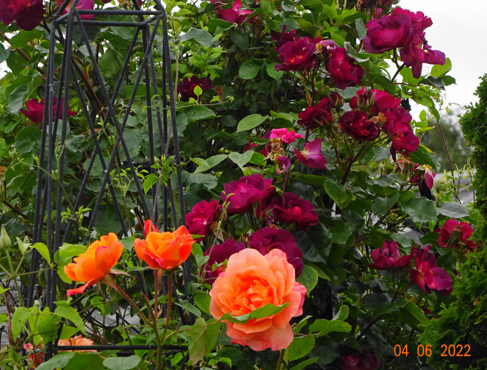 'Wild Rover'.. a tall floribunda/climber, scented of cloves with continuous bloom.. large glossy foliage.. the orange is 'Westerland'..