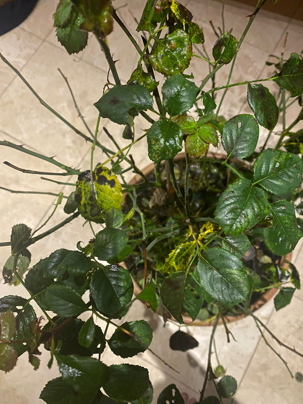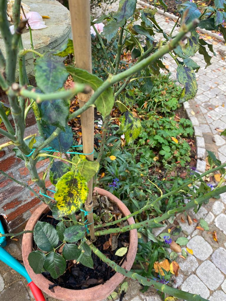 @Alfie_ you need a pot a minimum of 45cm wide by 45cm deep but the bigger the better for long term pot growth. You need to clear the leaves from around the surface of the pot of your roses. Remove all leaves that are infected with blackspot from your roses and disinfect your secateurs, if you use them, to minimise spreading the spores to other roses.