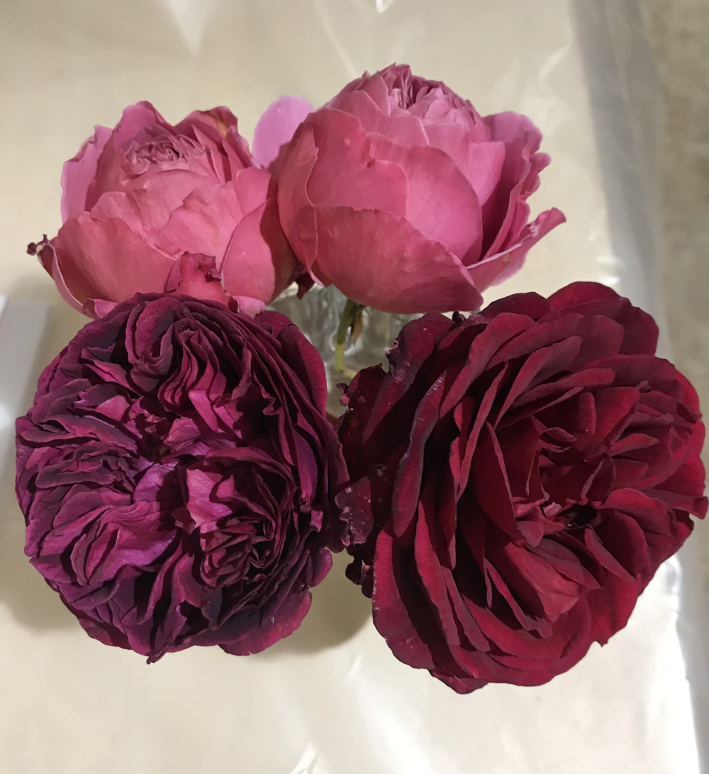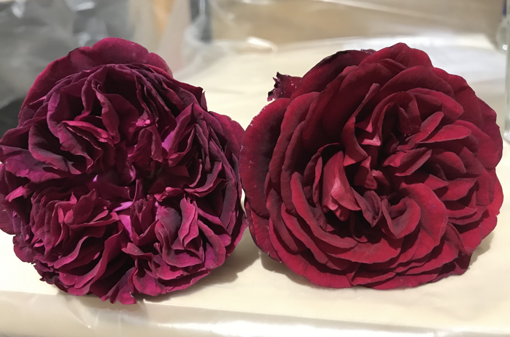 Rescued these blooms today. I have found the colour is darker and the scent is more pleasant than it was in summer. (Left) Falstaff, PAOK, (right) Tess of the d'Urbervilles