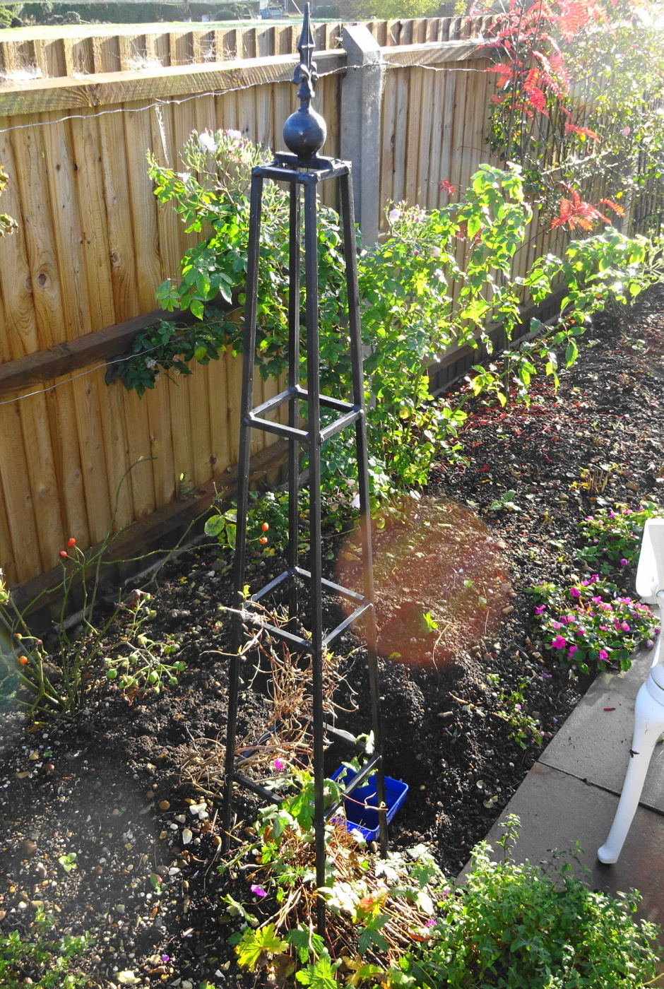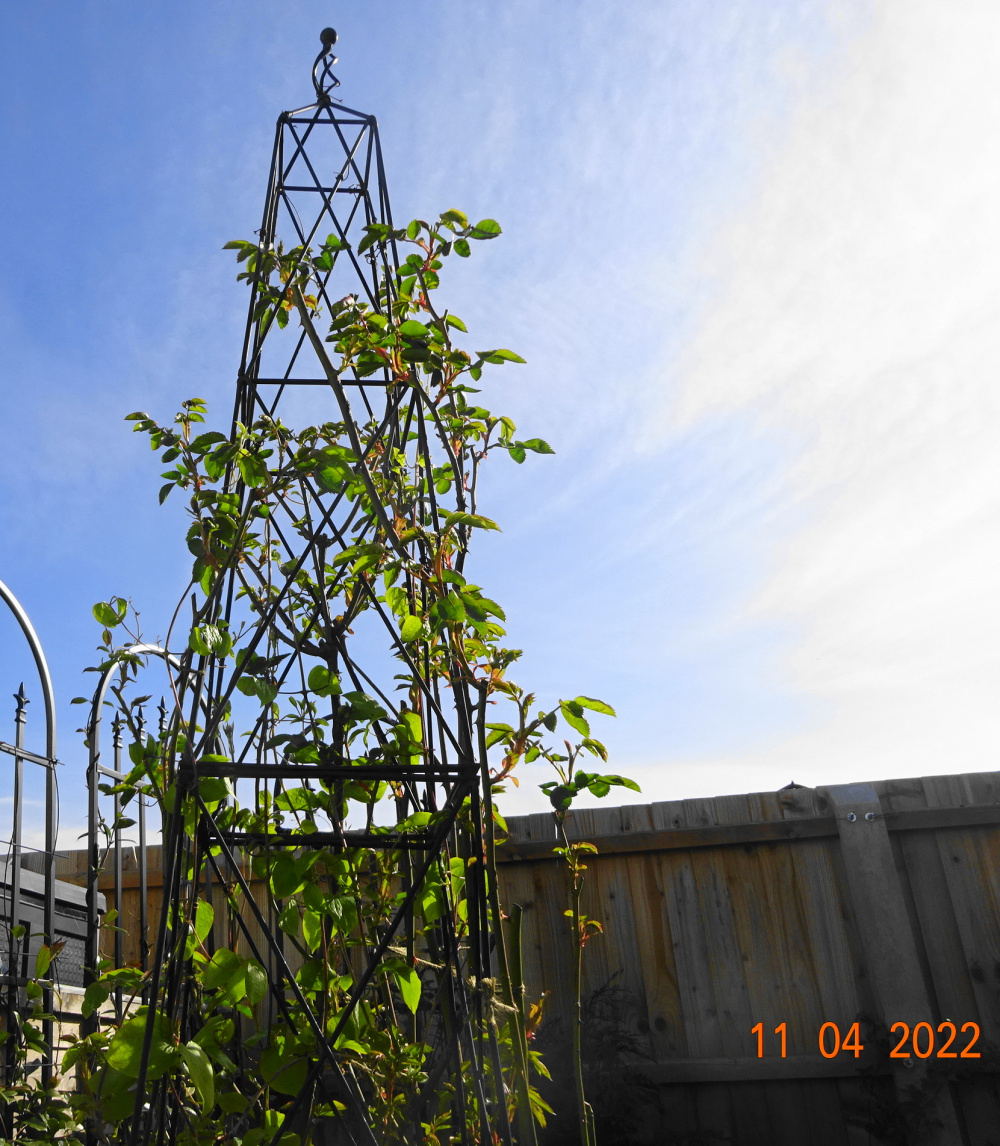 This 'Tottering by Gently' rose was planted E-S. I would have preferred to have planted it on the North side but I couldn't do that. Hence the growth will be away from the obelisk, to the right. I get around this by tying the canes tight to the structure and around it and through it, so I get flowers all around the support..
