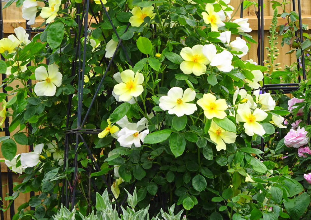 In June it smothers the obelisk.. with a clematis on another side, and a purple Geranium in the centre which climbs and surrounds the base.. This effect appeals to me very much and is the way I like to do things.. this view is from the South side, where it flowers best..