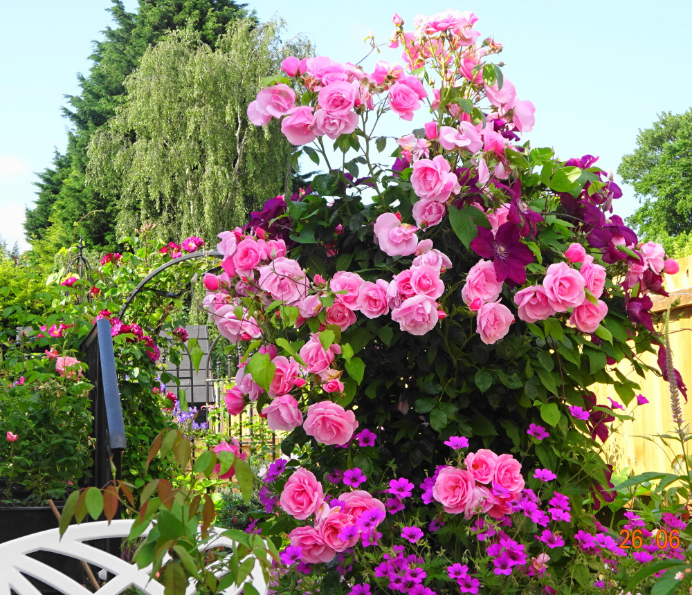 I like the rose/clematis/geranium combo Marlorena. I have the bourbon rose Mme. de Sévigné against an obelisk with a purple clem in the middle but the latter died right back before it got going this year. If it doesn’t return I might try your geranium idea and see if that works better, since I have an Orion going spare. Someone who no longer posts on here (gartner?) used to grow a pale lavender solanum with a climbing rose, that might be better still in my sun.