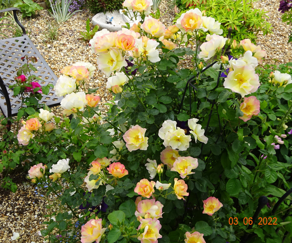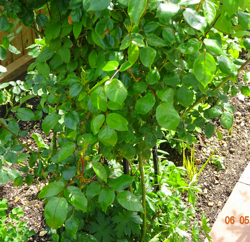 ..this 6 foot obelisk is being renovated.. ..the rose was planted on the north side, so naturally grew towards the South side but retaining north facing canes, with judicial pruning lower down, I got blooms all around it.. this is a May photo just before flowering showing the base area.. In June it smothers the obelisk.. with a clematis on another side, and a purple Geranium in the centre which climbs and surrounds the base.. This effect appeals to me very much and is the way I like to do things.. this view is from the South side, where it flowers best..